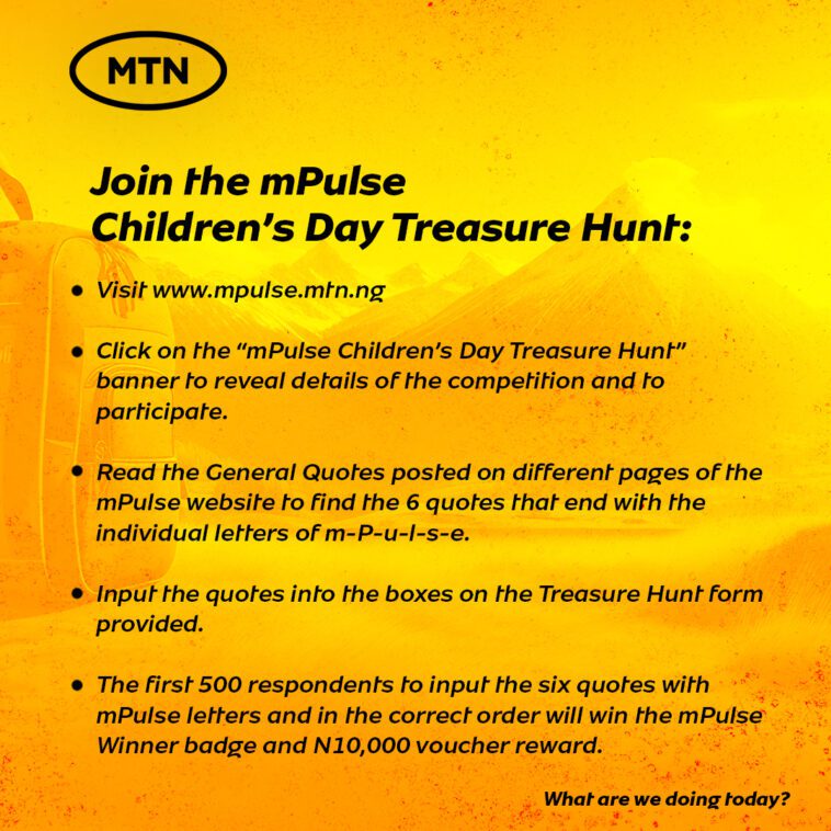 Children’s Day is a special day that honors the joy, innocence, and well-being of children all over the world. In commemoration of this significant day, MTN will host an exciting online treasure hunt on the mPulse website, with 500 lucky children standing a chance to win shopping vouchers worth 5 million Naira.