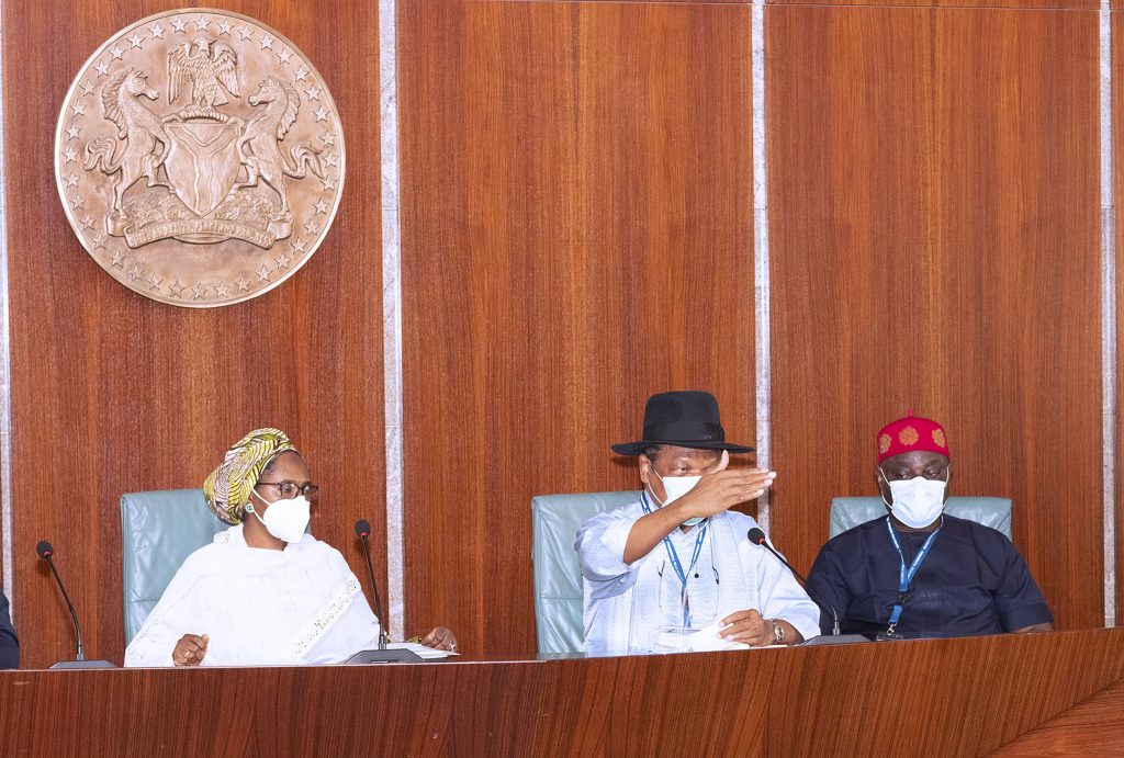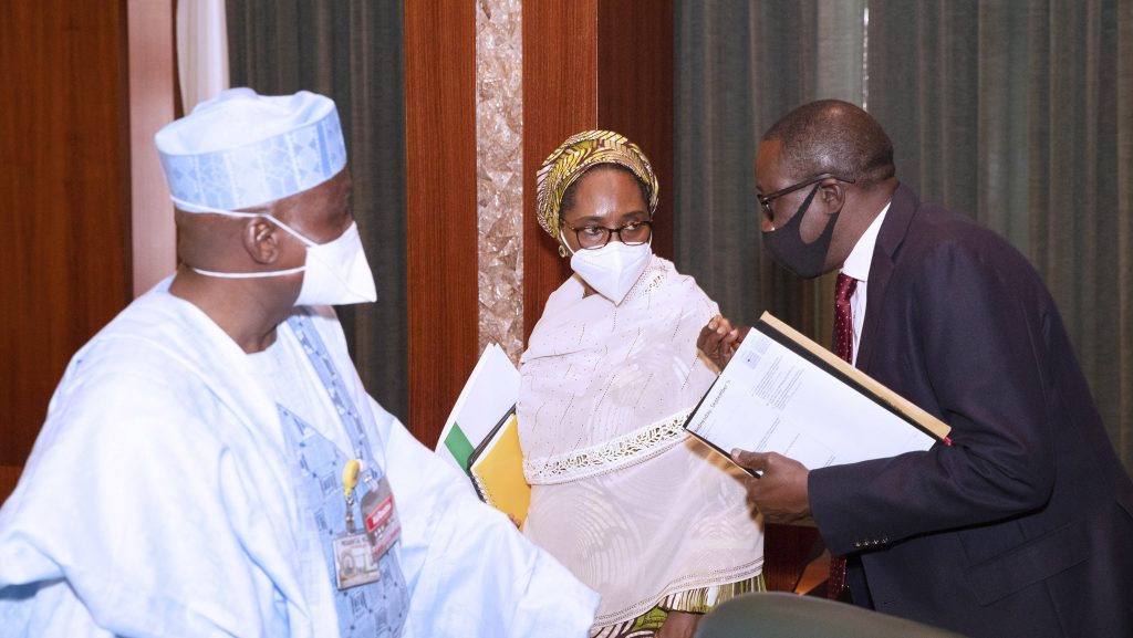 Minister of Finance, Hajiya Zainab Ahmed (M), NSA Maj Gen Babagana Monguno Rtd and SSAP Mallam Shehu Gartba
