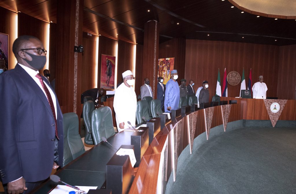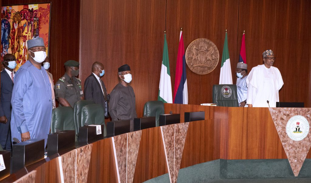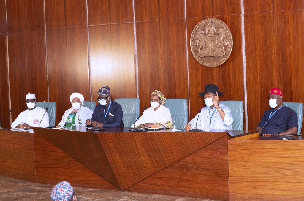 R-L; President Muhammadu Buhari. Vice President Yemi Osinbajo SAN, SGF Mr Boss Mustapha, Chief of Staff, Prof Ibrahim Gambari and NSA Maj Gen Babagana Monguno Rtd