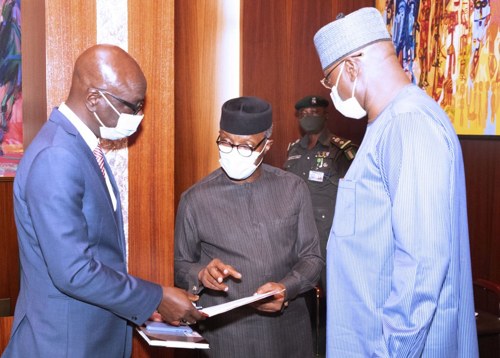 Vice President Yemi Osinbajo SAN (M) cHATS WITH SGF Mr Boss Mustapha and Deputy Chief of Staff to the President , Dr Ade Ipaye
