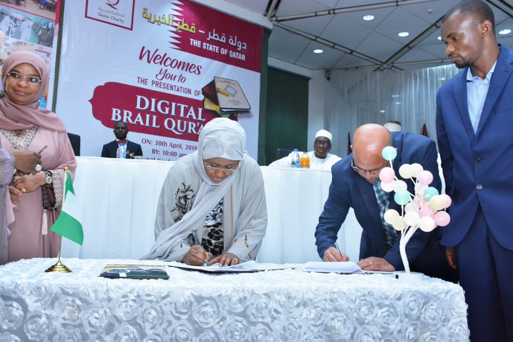 Wife of the President, Mrs. Aisha Muhammadu Buhari has commended Qatar Charity, an international humanitarian organization, for their activities across Nigeria. She was speaking during the presentation of Digital Braille Quran for use by visually impaired students at the International Conference Center, Abuja on 30th April, 2019.