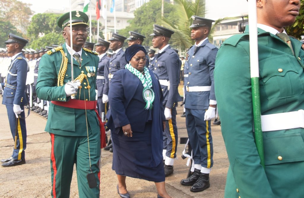 Representative of Lagos State Governor & Deputy Governor, Dr. (Mrs) Idiat Oluranti Adebule, inspecting the Guard of Honour