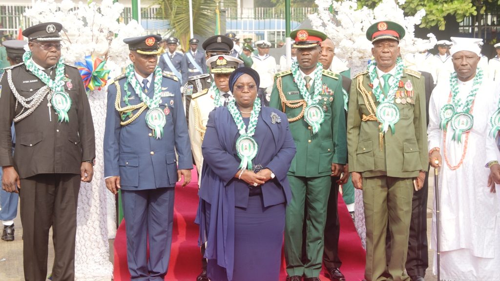 Representative of Lagos State Governor & Deputy Governor, Dr. (Mrs) Idiat Oluranti Adebule (middle in front); with Representative of the State Commissioner of Police, Deputy Commissioner of Police (DCP) Elkanah Ayuba (left); Commander 651 Base Group, Ikeja, Air Commodore Sunday Makinde (2nd left); Commanding officer, NNS Beecroft, Rear Admiral Okon Eyo (3rd left); Commander, 9 Brigade, Nigerian Army, Ikeja Cantonment, Brigadier General T.A. Lagbaja (3rd right); Chairman, Nigerian Legion, Lagos State Chapter, Col. Samuel Akande, Rtd. (2nd right) and Representative of the Oba of Lagos & Opeluwa of Lagos, Chief Lateef Aderibigbe Ajose