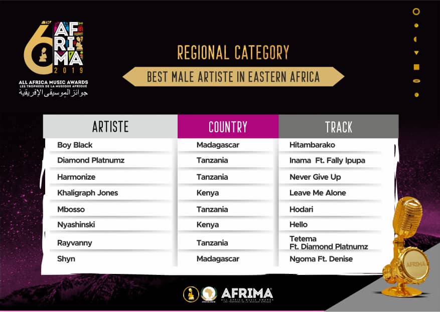 For Eastern Africa; we have great contenders including Sheebah from Uganda; Vanessa Mdee from Tanzania; Nikita Kering from Kenya with Tanzanian Diamond platinum, Rayvanny, Mboso, and Kenyan Khaligraph Jones and Nyashinski.