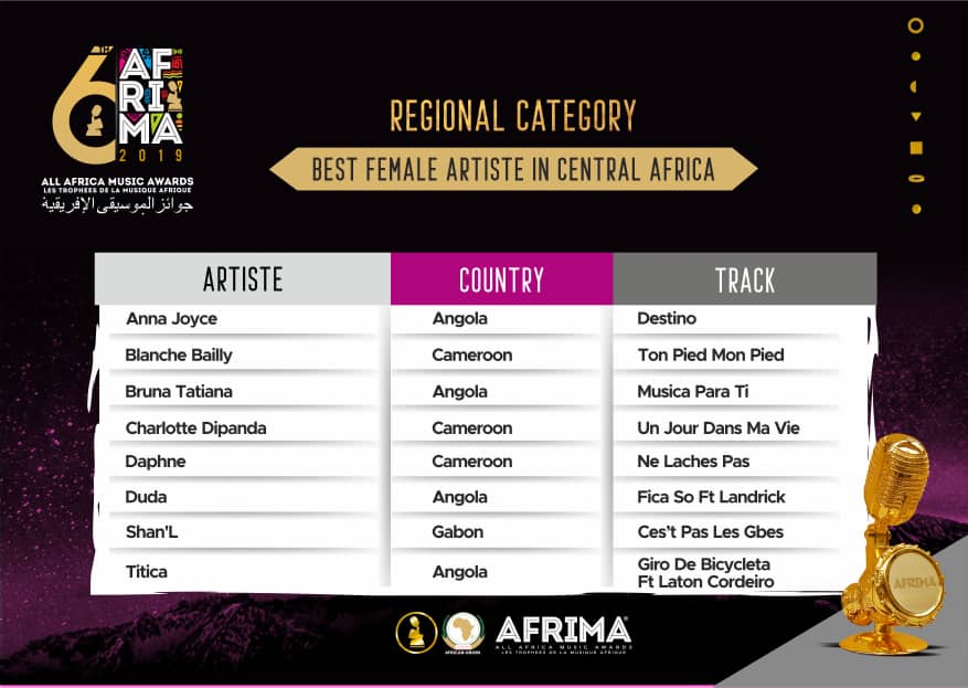 This year’s list showcases a wide range of creativity and talents both from new and known artiste across the regions. Artiste like Shatta Wale, Kizz Daniel, Salif Keita, Burna Boy will be competing for the Best Male category in Western Africa, while Teniola, Simi, Aya Nakamura, Mzvee, YemiAlade amongst others will be competing for the Best Female category in Western Africa. Dominating Central Africa include Cameroonian artiste Blanche Baily, Charlotte Dipanda, Daphne alongside their male counterpart Locko, Magasco and Salatiel.