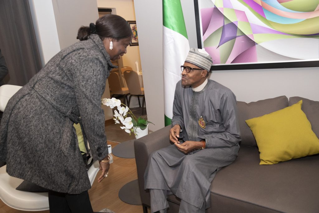 President Muhammadu Buhari chat with Chairman and Chief Executive Officer of the National Diaspora Commission. Hon Abike Dabiri-Erewa
