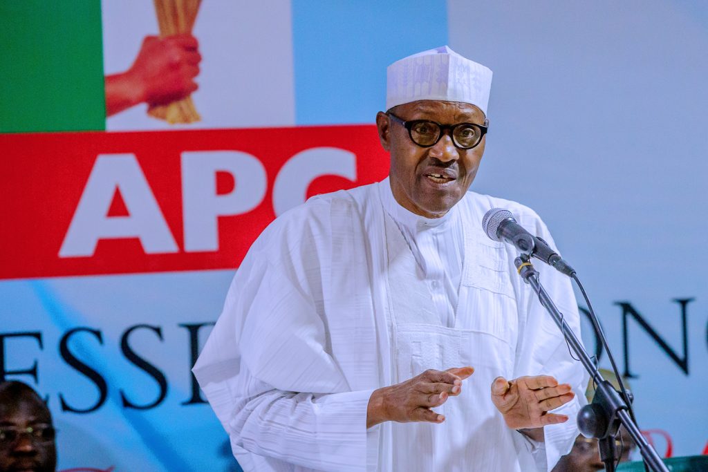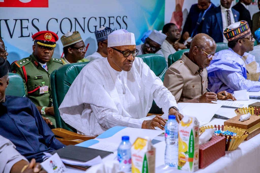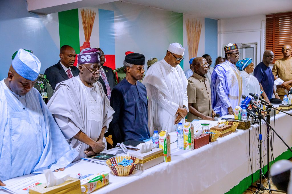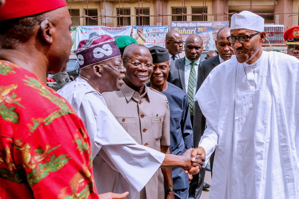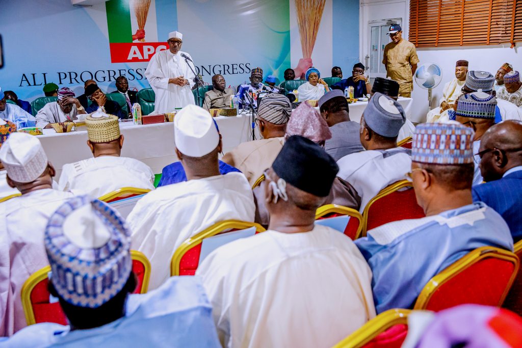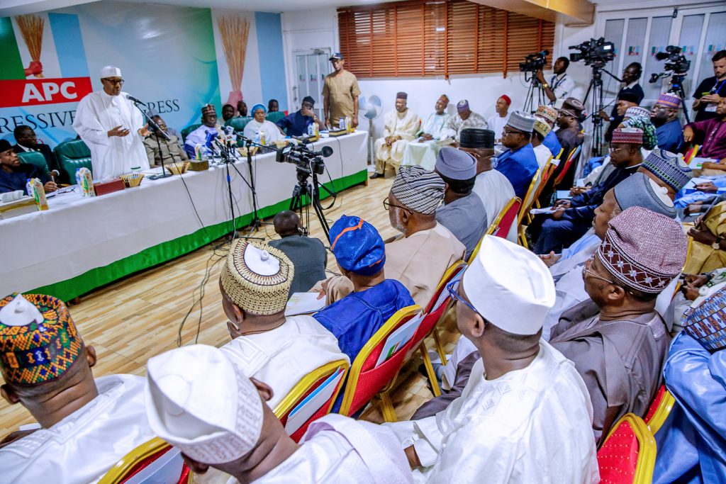 President Buhari with Zamfara State Governor Abdulaziz Yari, APC Chieftain Bola Ahmed Tinubu, Vice President Yemi Osinbajo, APC National Secretary Alhaji Mai Mala Buni, APC National Women Leader Hajia Salamatu Baiwa and Deputy National Chairman Otunba Niyi Adebayo as he attends APC Caucus Meeting at the APC Headquarters in Abuja on Monday, February 18, 2019.