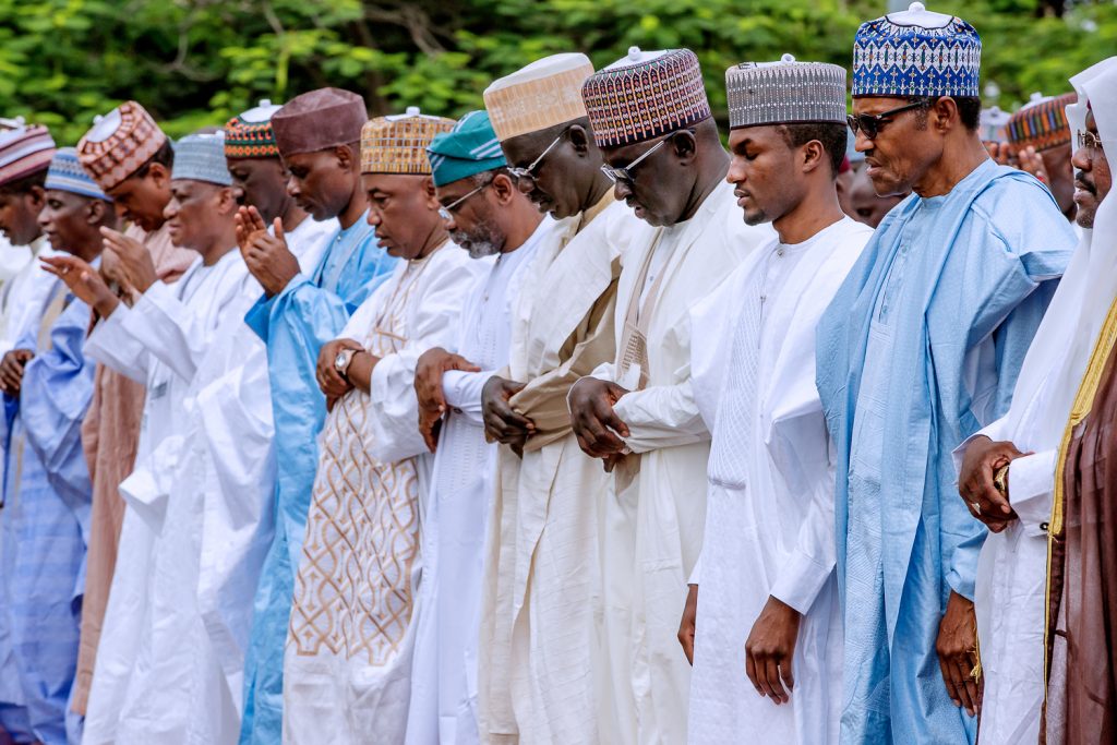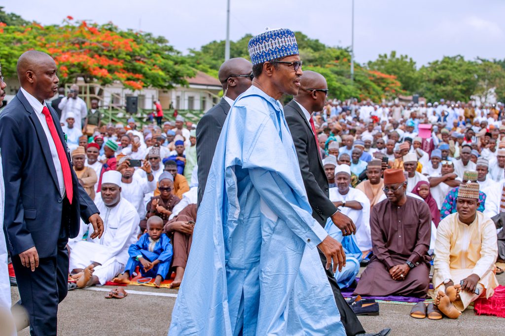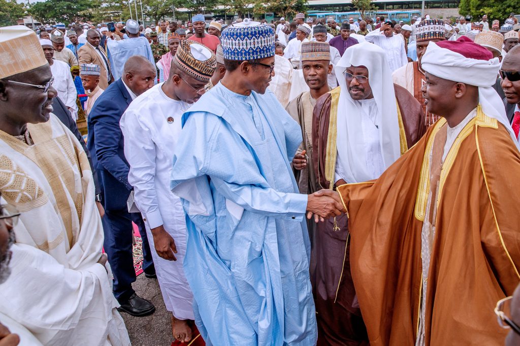 President Buhari with Chief Imam Captain Yusuf and Chief of Army Staff Lt Gen. TY Buratai as he attends Eid El Filtri Prayers at the Mabilla Barracks Eid Praying Ground on Tuesday, June 4, 2019.