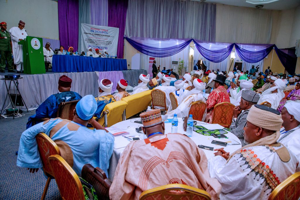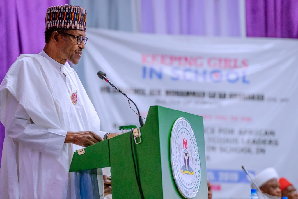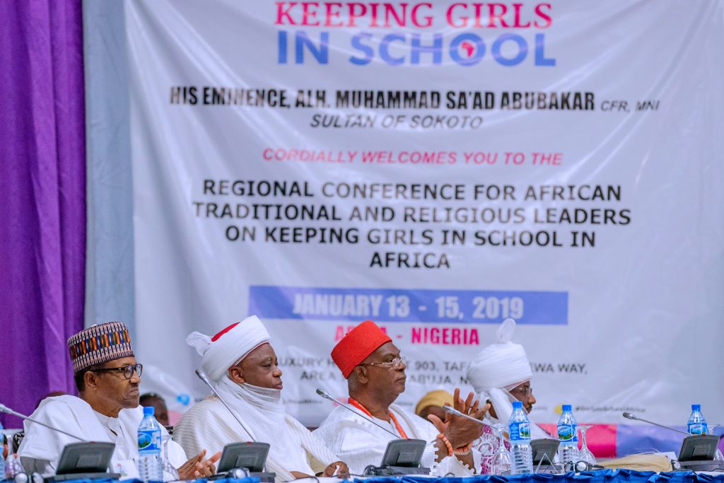President Muhammadu Buhari during a Regional Conference for African Traditional and Religious Leaders on keeping Girls in School in Africa attended by 22 African Countries organised by Sultan of Sokoto for Peace and development Foundation held in Abuja, Nigeria on Monday, January 14, 2019.
