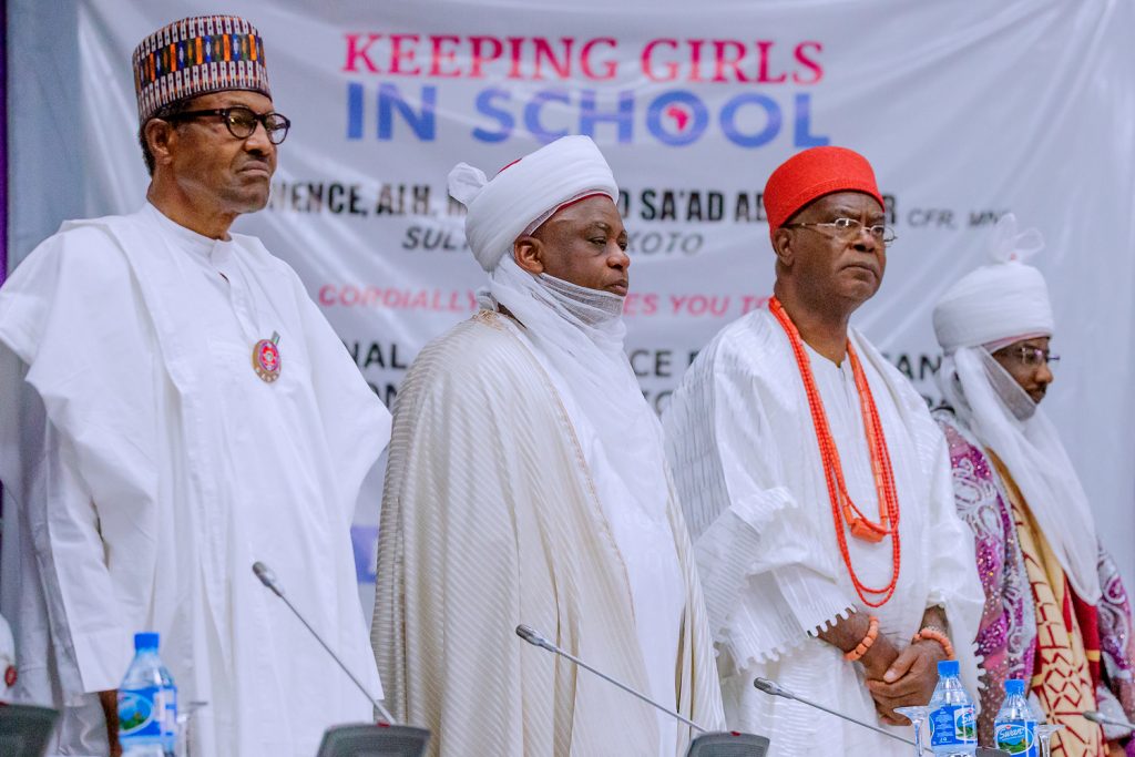 PRESIDENT BUHARI ATTENDS KEEPING GIRLS IN SCH REGIONAL CONFERENCE 6. President Muhammadu Buhari (M) flanked by the His Eminence, Sultan of Sokoto, Allhaji Muhammad Sa’Ad Abubakar, Obi Of Onitsha – HRH Obi Nnaemeka Achebe, The Emir of Argungu, Kebbi State, Alhaji Samaila Mera, Minister of Education, Mallam Adamu Adamu, Minister of Interior, Lt General Abdulrahman Dambazzau and 22 Africa Countries during a Regional Conference for African Traditional and Religious Leaders on keeping Girls in School in Africa orgnaised by Sultan of Sokoto for Peace and development Foundation held in Abuja, Nigeria. PHOTO; SUNDAY AGHAEZE. JAN 14 2019