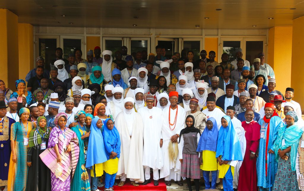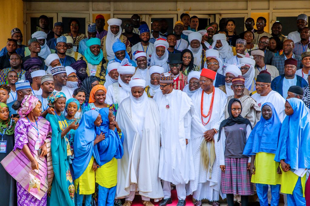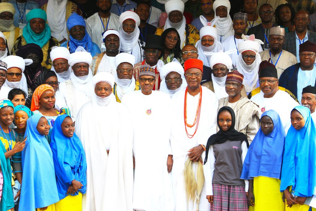President Muhammadu Buhari (M) flanked by the His Eminence, Sultan of Sokoto, Allhaji Muhammad Sa’Ad Abubakar, Obi Of Onitsha – HRH Obi Nnaemeka Achebe, The Emir of Argungu, Kebbi State, Alhaji Samaila Mera, Minister of Education, Mallam Adamu Adamu, Minister of Interior, Lt General Abdulrahman Dambazzau and 22 Africa Countries