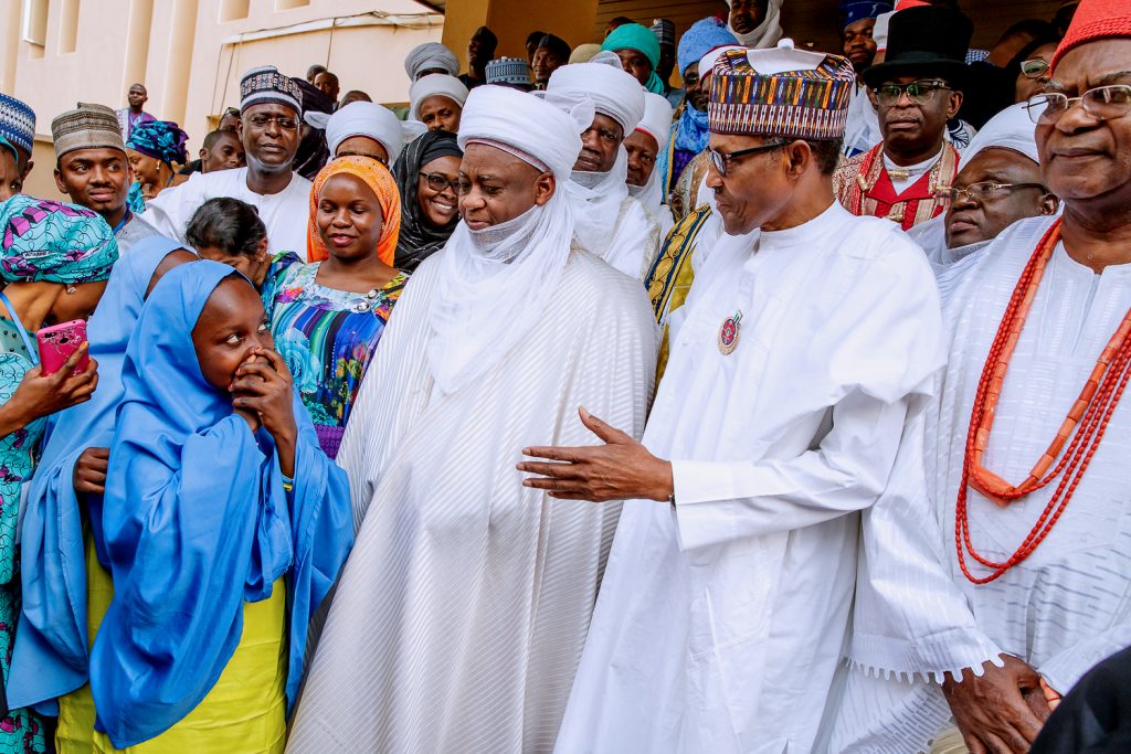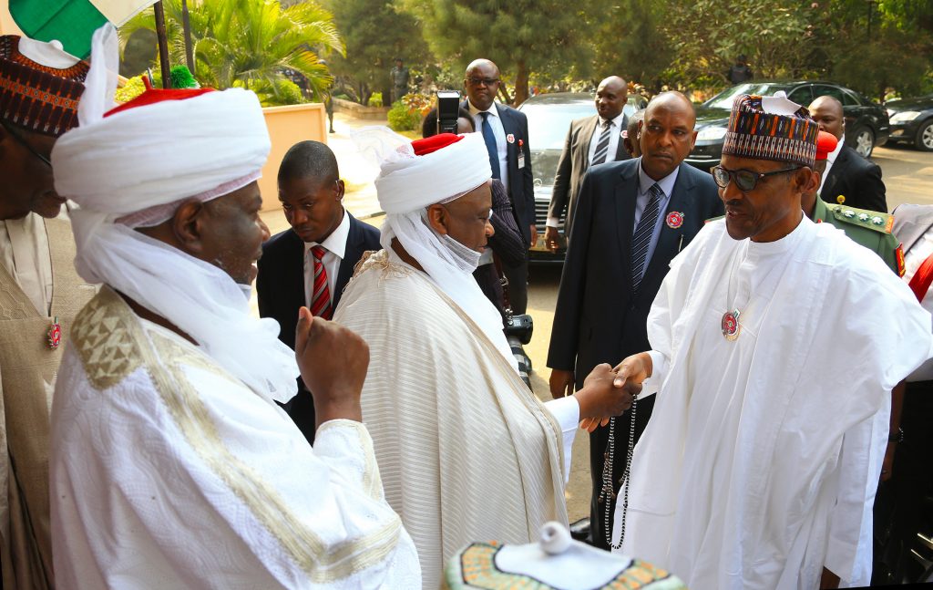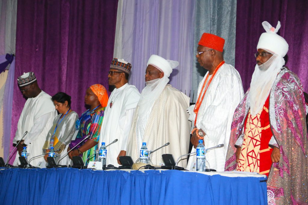 From Right; His Highness, Emir of Kano, Mallam Muhammadu Sanusi 11, Obi Of Onitsha – HRH Obi Nnaemeka Achebe, His Eminence, Sultan of Sokoto, Allhaji Muhammad Sa’Ad Abubakar, President Muhammadu Buhari, Representative of Kabaka of Buganda, Representatives of UN Deputy Secretary General and others