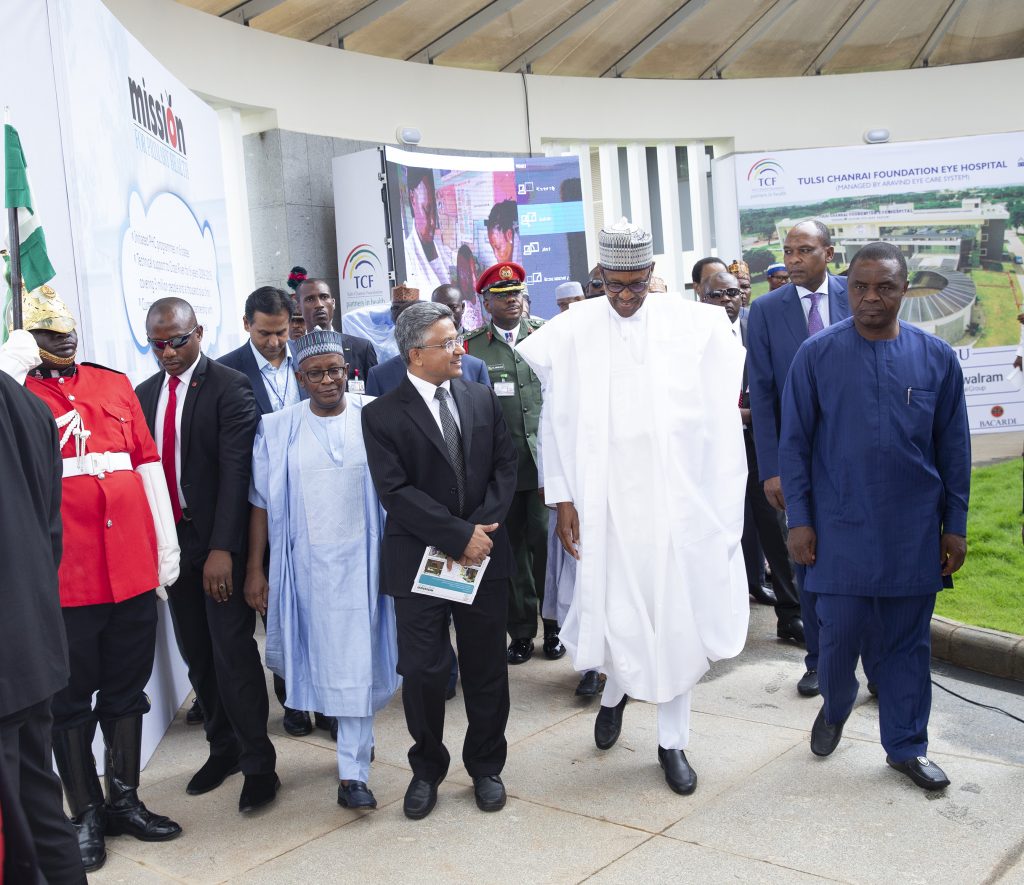 FCT, Permanent Secretary, Mr. Ohaa Chinyeaka Christian, Permanent Secretary Ministry. of Health, Abdullahi Mashi, President Muhammadu Buhari, Chairman of the Board of Trustee, Tulsi Chanrai Foundation, Alhaji Ahmed Joda, Chairman of Tulsi Chanrai Foundation Eye Hospital, Mr Jogdish Chanrai and India High Commissioner to Nigeria