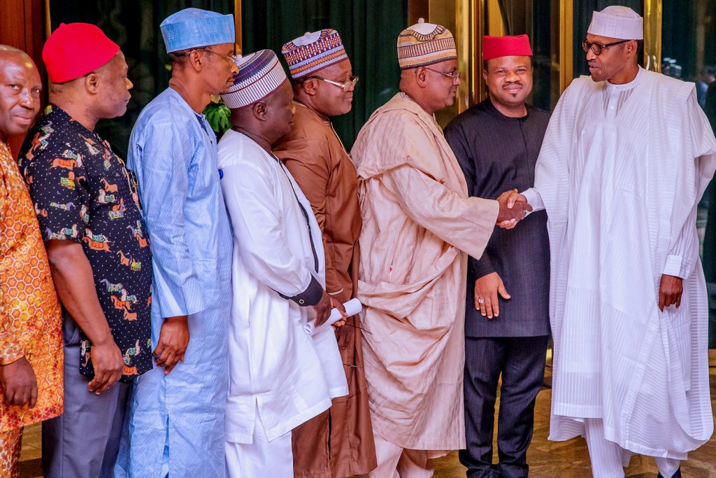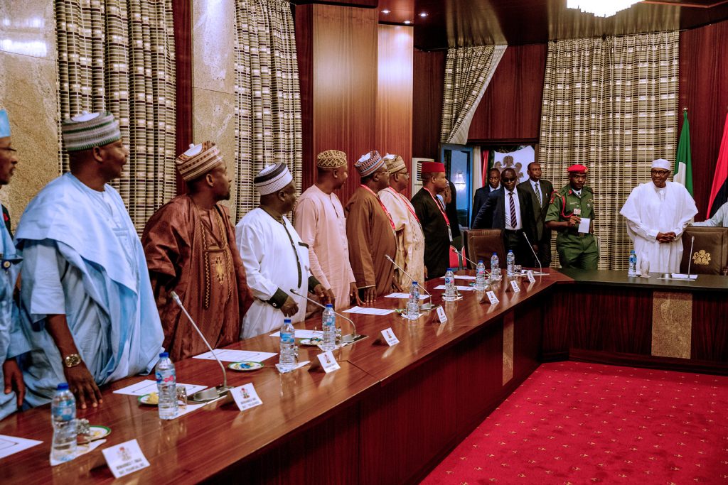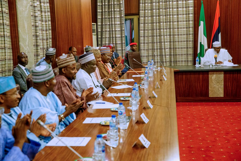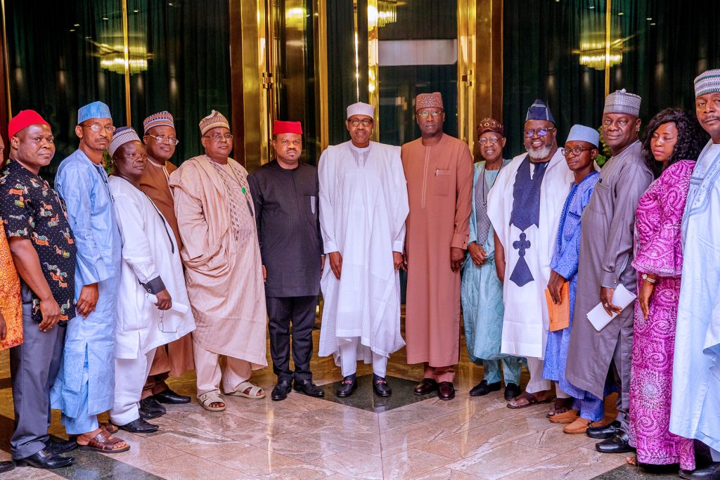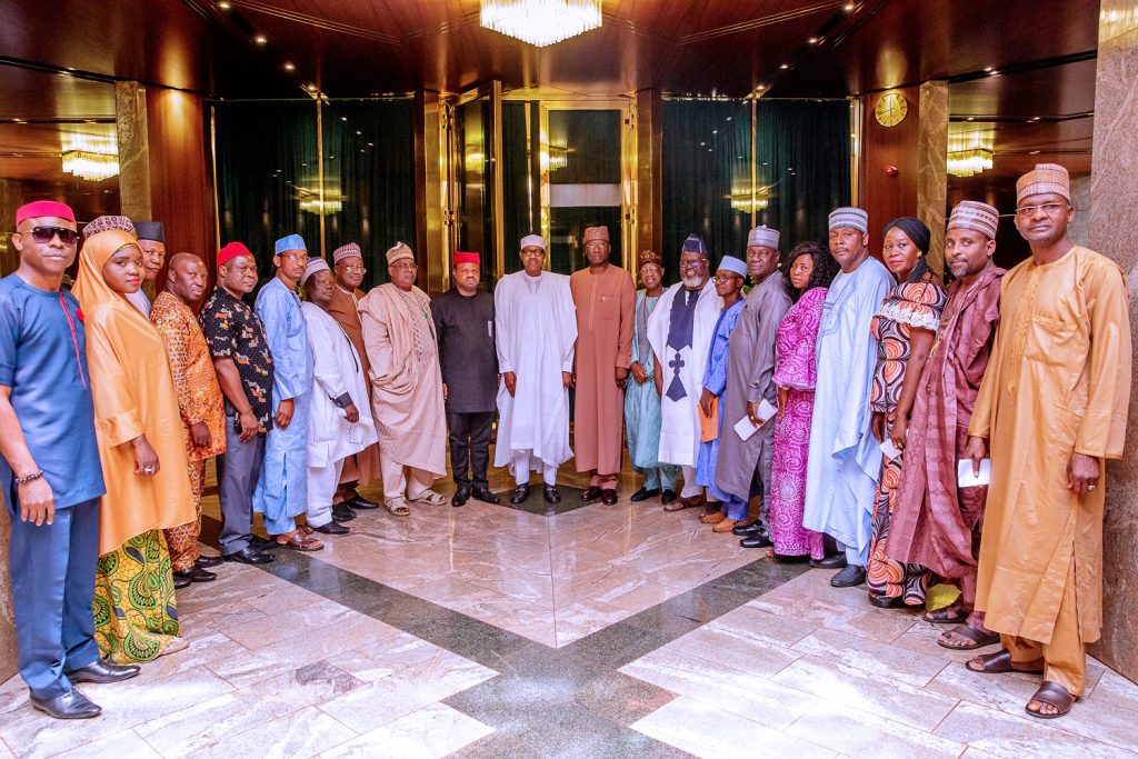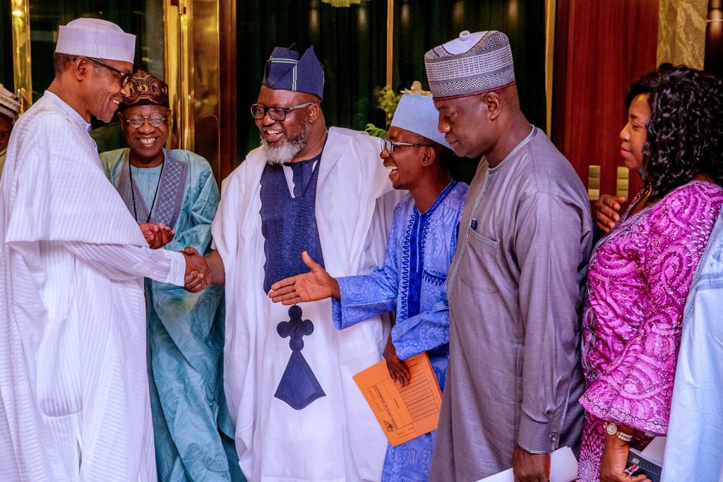 President Buhari with R-L: NUJ President Chris Isiguzo, Dep. President Muktar Gidado, Nat. Sec. Shuaibu Usman, Vice President 2 Wilson Bako, Nat. Fin Sec. Mohammed Tukur and Vice President Yusuf Idris and Chairman FCT Emmanuel Ogbeche as he received in audience National Leadership of Nigeria Union of Journalists in State House, Abuja on Thursday, March 21, 2019.