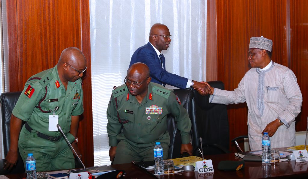 SGF Mr. Boss Mustapha in a handshake with the Minister of Defence, Brig General Masur Dan Ali, Others Chief of Defence Staff, General Abayomi Olonisakin and Maj-Gen Ali A. Nani