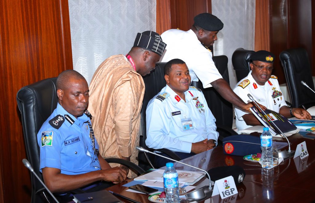 L-R; Inspector General of Police, Mr. Mohammed Adamu, Chief of Air Staff, Air Marshal Sadique Abubakar, Chief of Naval Staff, Admiral Ibok Ekwe Ibas and others