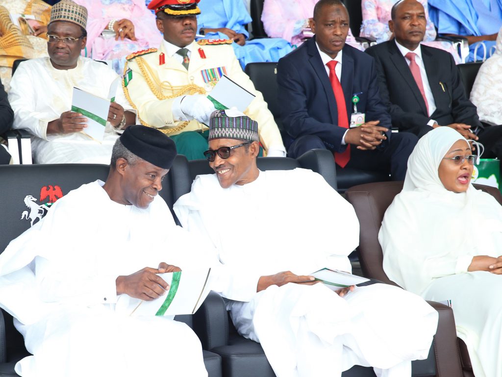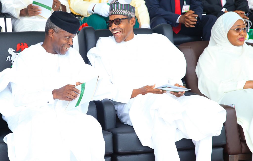 The Vice President Prof Yemi Osinbajo SAN and The President Muhammadu Buhari cracking jokes. With them is the wife Dr Aisha