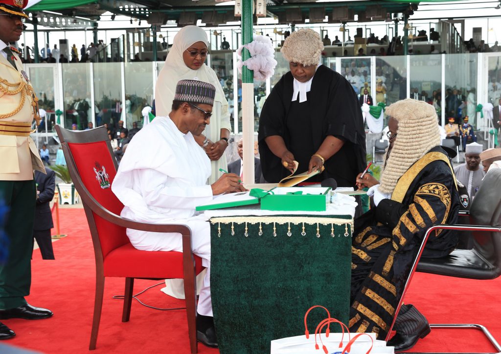 The President Muhammadu Buhari flanked by his wife Dr Aisha signing the oath of office