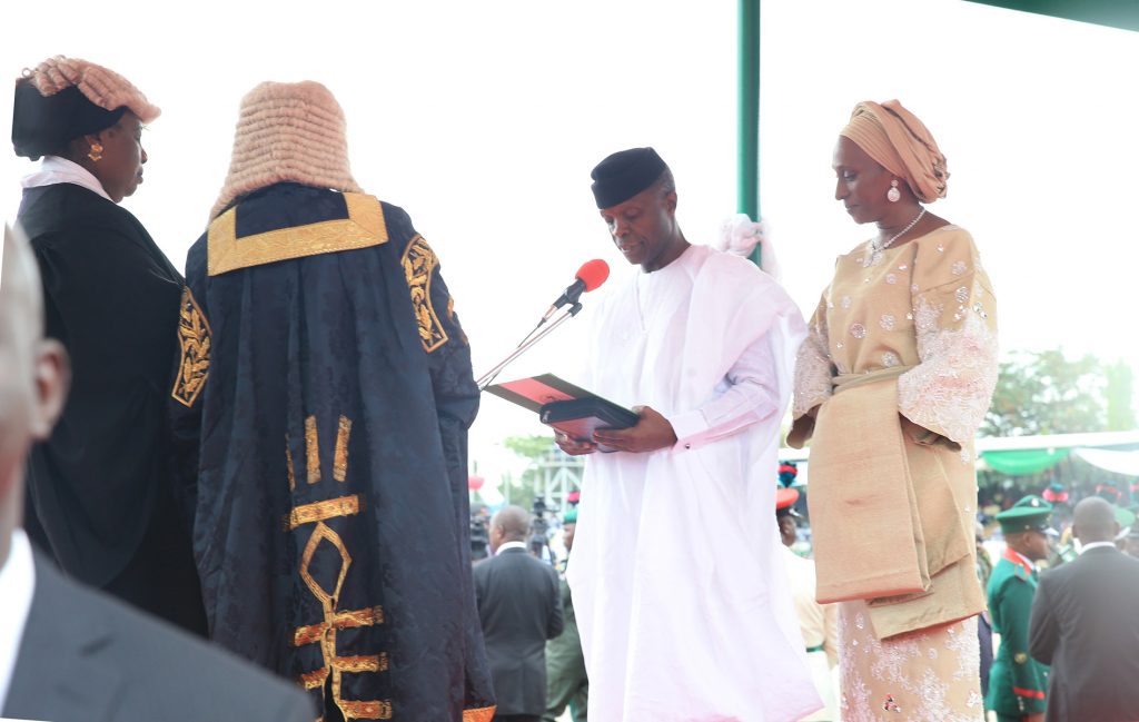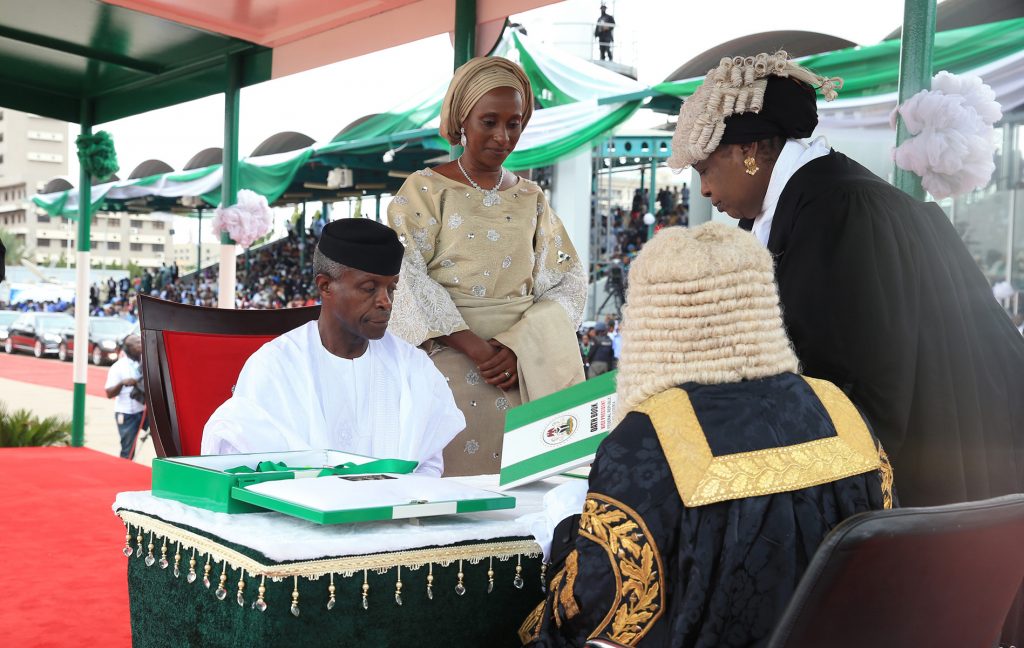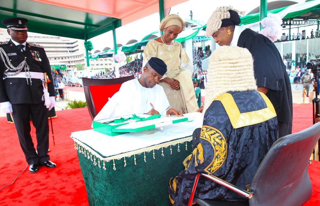 The Vice President Prof Yemi Osinbajo SAN flanked by his wife Dolapo signing the oath of office