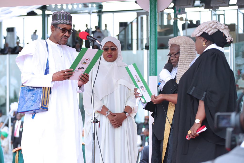 Taking the oath of office, The President Muhammadu Buhari and his wife Dr Aisha