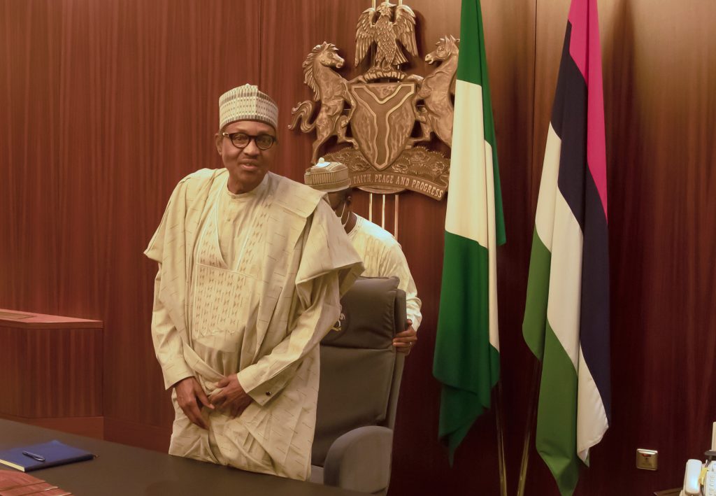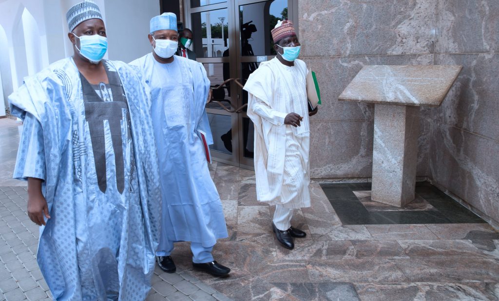 President Muhammadu Buhari meeting with Chairman, APC Governors’ Forum and Kebbi State governor, H.E Atiku Bagudu accompanied by the Governor of Jigawa State , H.E Mohammed Badaru Abubakar and Plateau State Governor, H.E Simon Lalong over the party Crisis, State House, Abuja on Monday, June 22, 2020.