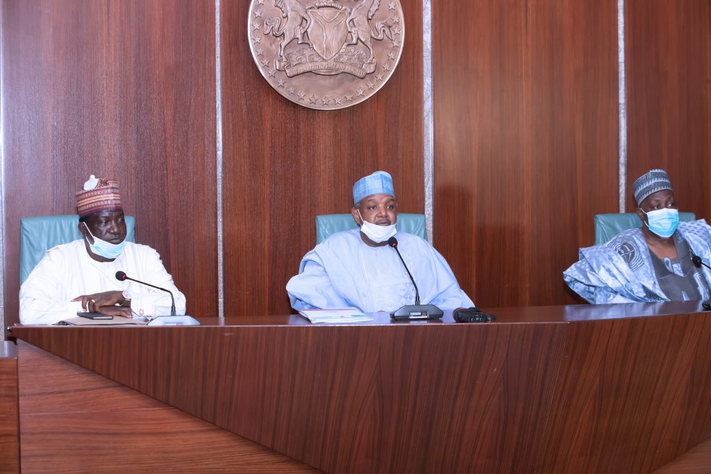PRESIDENT BUHARI MEETS SOME GOV OVER APC CRISIS 6A&B. Chairman, APC Governors’ Forum and Kebbi State governor, H.E Atiku Bagudu (M) flanked by the Governor of Jigawa State , H.E Mohammed Badaru Abubakar and Plateau State Governor, H.E Simon Lalong briefing the State House Media after Meeting with the President over the party Crisis, State House Abuja. PHOTO; SUNDAY AGHAEZE. JUNE 22 2020