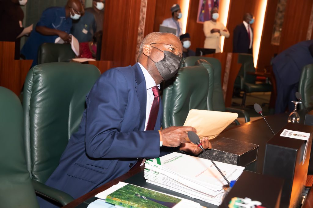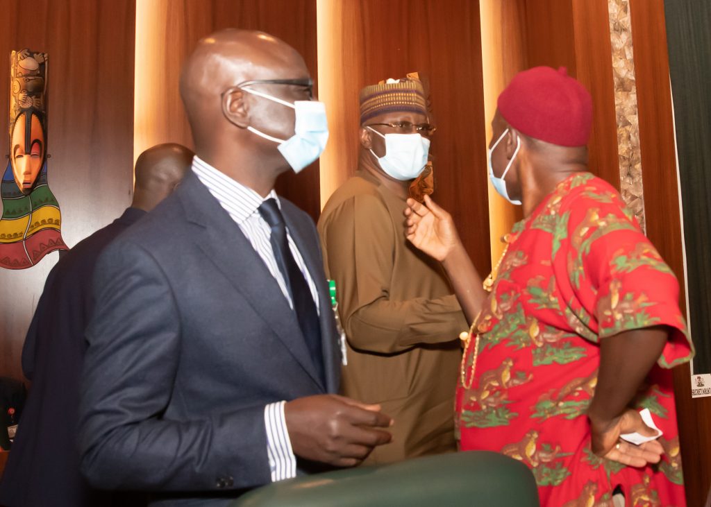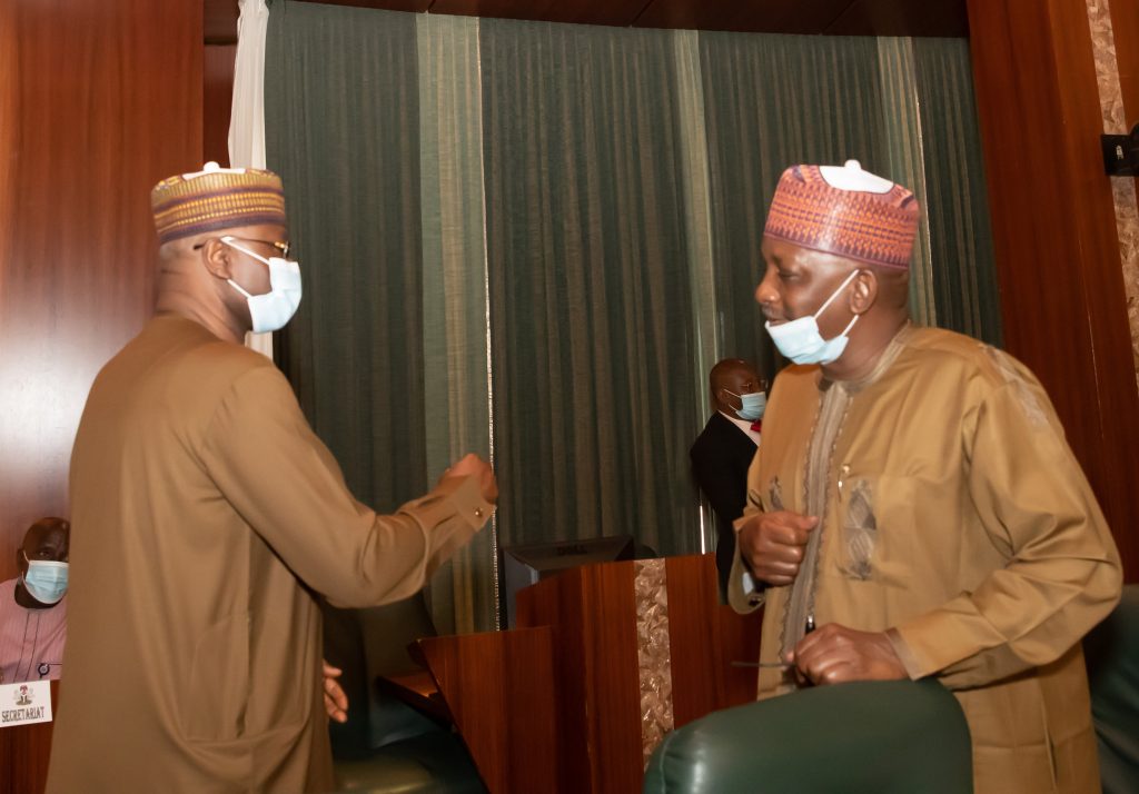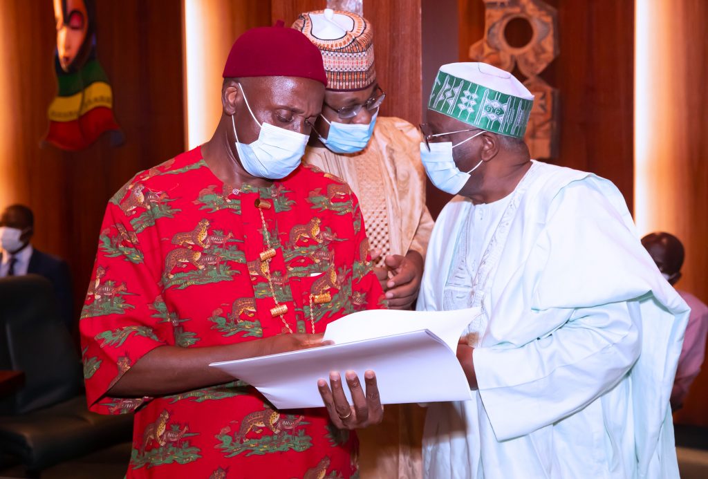 PRESIDENT BUHARI PRESIDES OVER A VIRTUAL FEC MEETING. AB. L-R; Chief of Staff, Prof Ibrahim Gambari, Minister of Communications and Digital Economy, Dr Ali Isa Pantami, and Minister of Transportation, Rt Hon Rotimi Amaechi during A virtual FEC Meeting held at the Council Chambers, State House, Abuja. PHOTO; SUNDAY AGHAEZE. OCT 14 2020