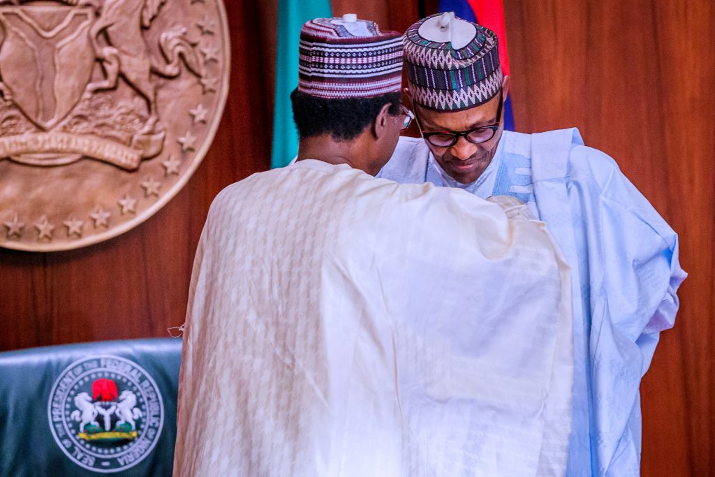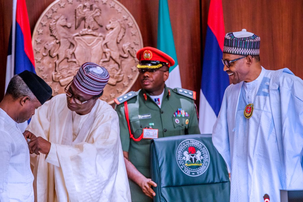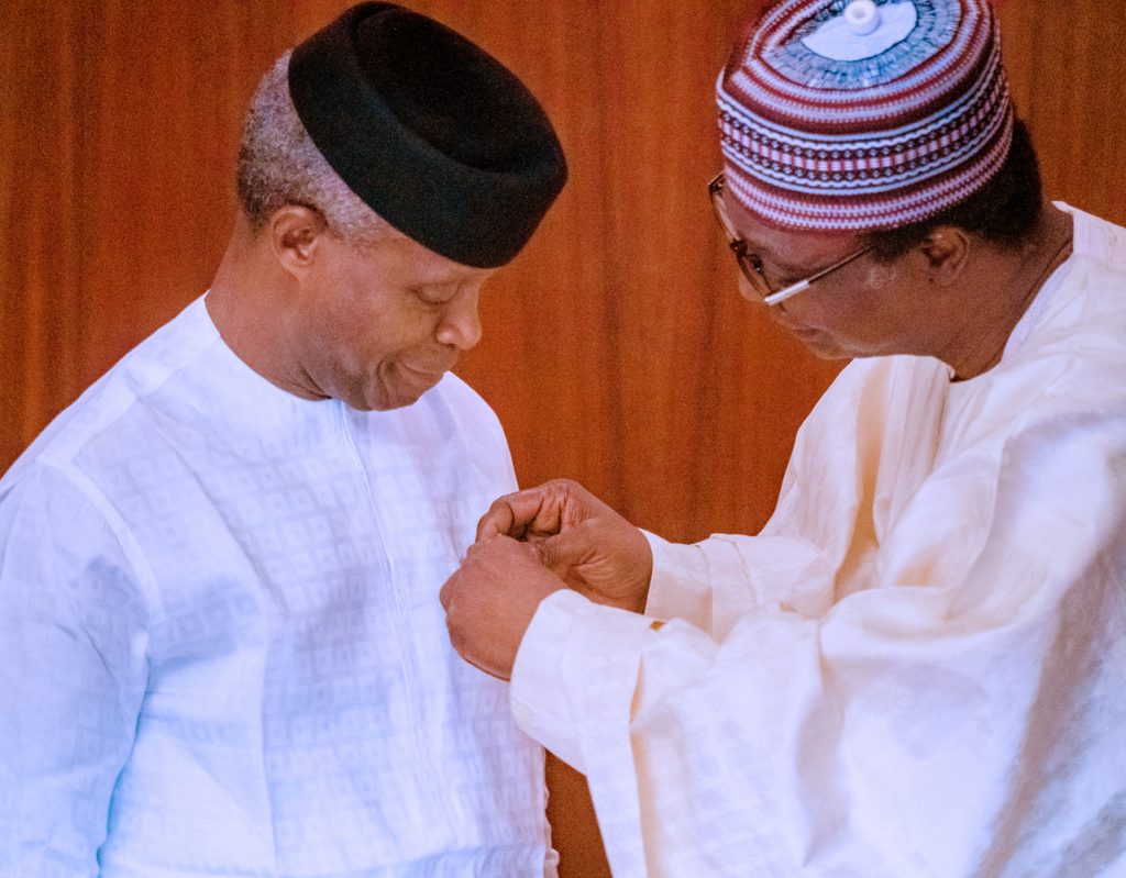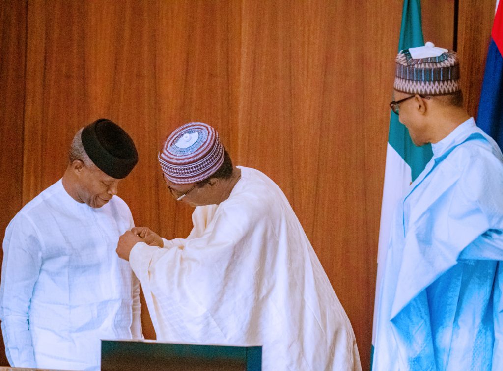 President Buhari watches as Chairman Nigerian Legion Brig. Gen. Adakole Akpa Rtd decorates Vice President Yemi Osinbajo as he presides over Emblem Appeal Launch for the Armed Forces Remembrance Day Celebration in State House, Abuja on Wednesday, October 16, 2019.