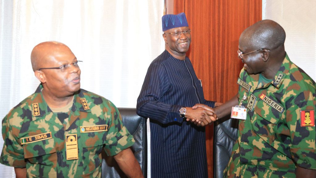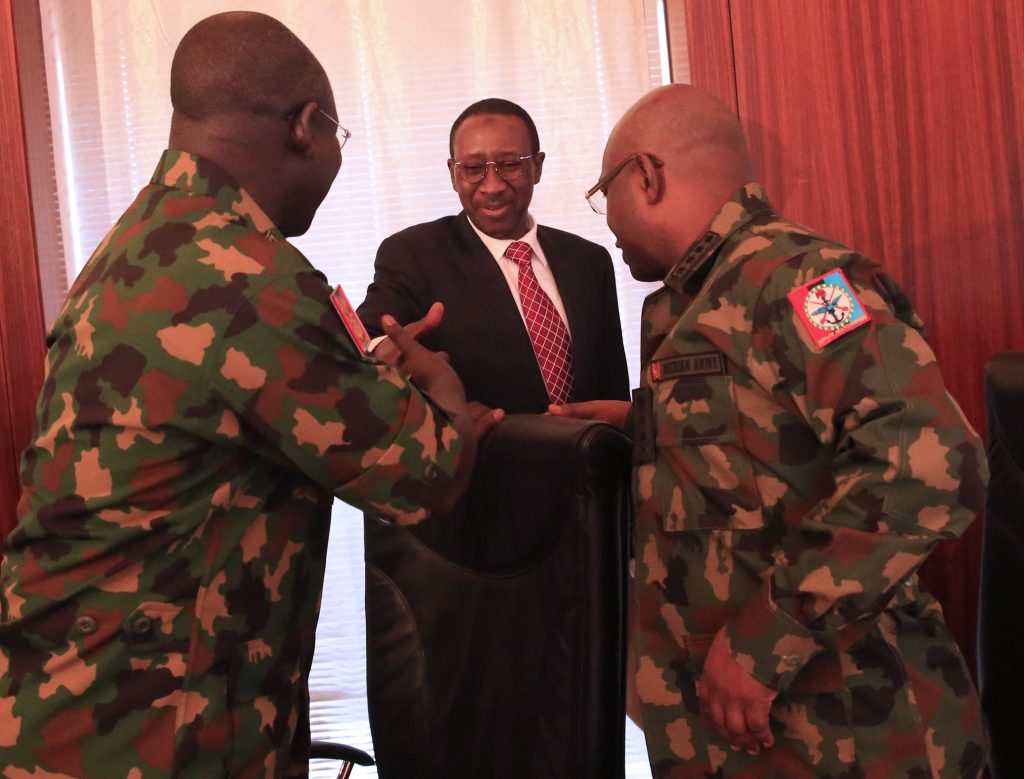 SGF Mr. Boss Mustapha chats with Chief of Defence Staff, General Abayomi Olonisakin and Chief of Army Staff LT-Gen T.Y. Buratai