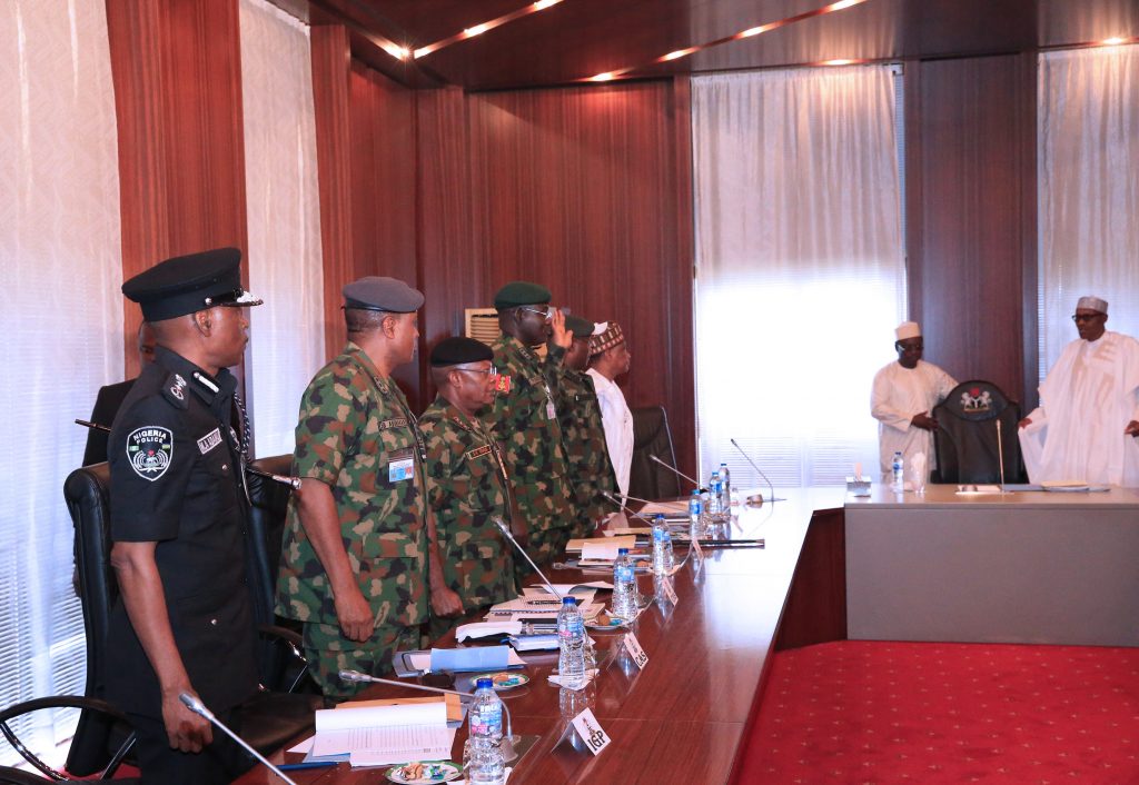 R-L; President Muhammadu Buhari, Minister of Defence Brig-Gen Mansur Dan Ali, Chief of Defence Staff, General Abayomi Olonisakin, Chief of Army Staff LT-Gen T.Y. Buratai, Chief of Nava Staff, Vice Admiral Ibok-Ete Ekwe Ibas, Chief of Air Staff, Air Marshal Sadique Abubakar and Inspector General of Police, Mr Mohammed Adamu