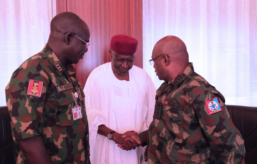 National Security Adviser to the President Maj-Gen Babagana Monguno in a warm greeting with Chief of Defence Staff, General Abayomi Olonisakin and Chief of Army Staff LT-Gen T.Y. Buratai