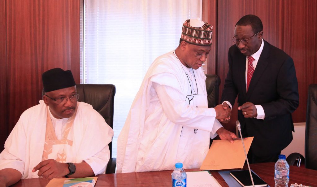 R-L; National Security Adviser to the President Maj-Gen Babagana Monguno Minister of Defence, Brig Gen Mansur Dan Ali and Minister of Interior, Lt Gen Abdulrahman Dambazzau Rtd