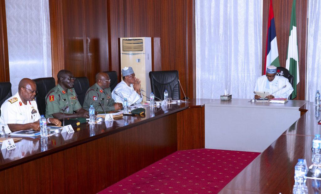 R-L; President Muhammadu Buhari, Minister of Defence, Brig Gen Mansur Dan Ali, Chief of Defence Staff, General Abayomi Olonisakin, Chief of Army Staff, Lt Gen T.Y Buratai, Chief of Naval Staff Vice Admiral Ibok Ekwe Ibas, Representatives of Chief of Air Staff, Chief of Training and Operations (CTOPS), Air Vice Marshal EO Anebi and Acting Inspector General of Police, Mohammed Abubakar Adamu