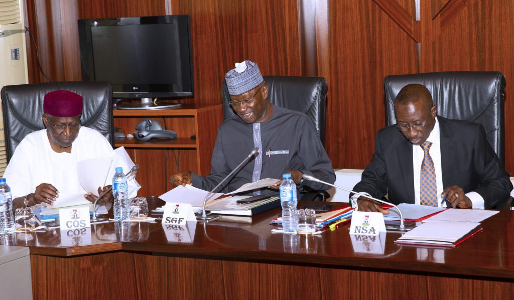 L-R; Chief of Staff, Mallam Abba Kyari, SGF Mr. Boss Mustapha and NSA Maj-General Babagana Monguno