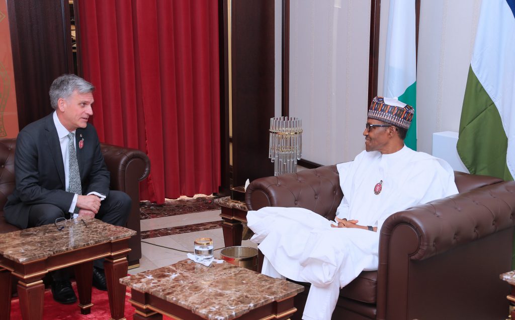 President Muhammadu Buhari (Right) chats with the Canadian High Commissioner to Nigeria, H.E Philip Baker