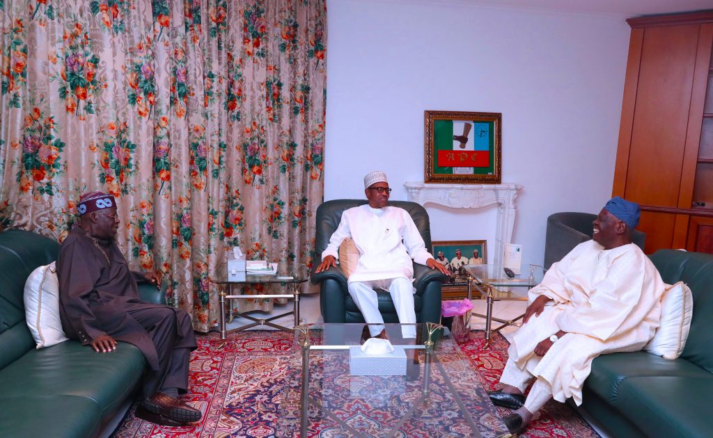 President Buhari receives APC chieftain, Chief Bisi Akande and APC National Leaders, Senator Ahmed Bola Tinubu at the residence, Presidential Villa, Abuja on Monday night.