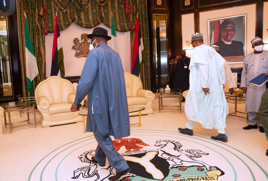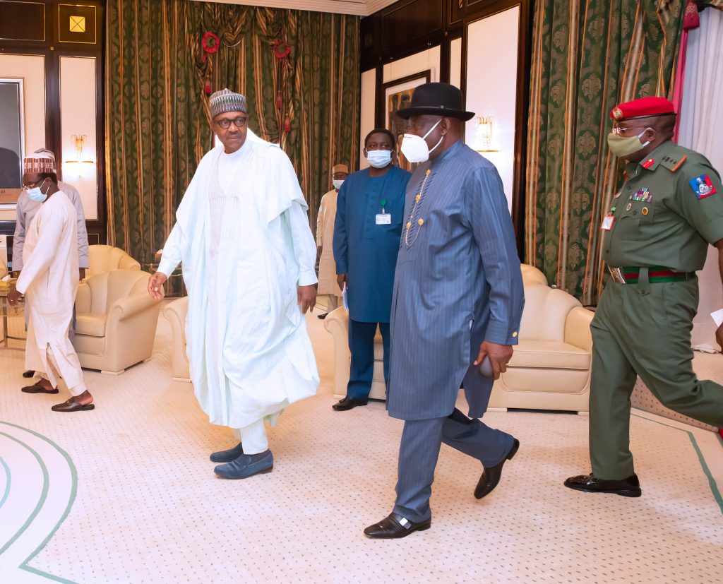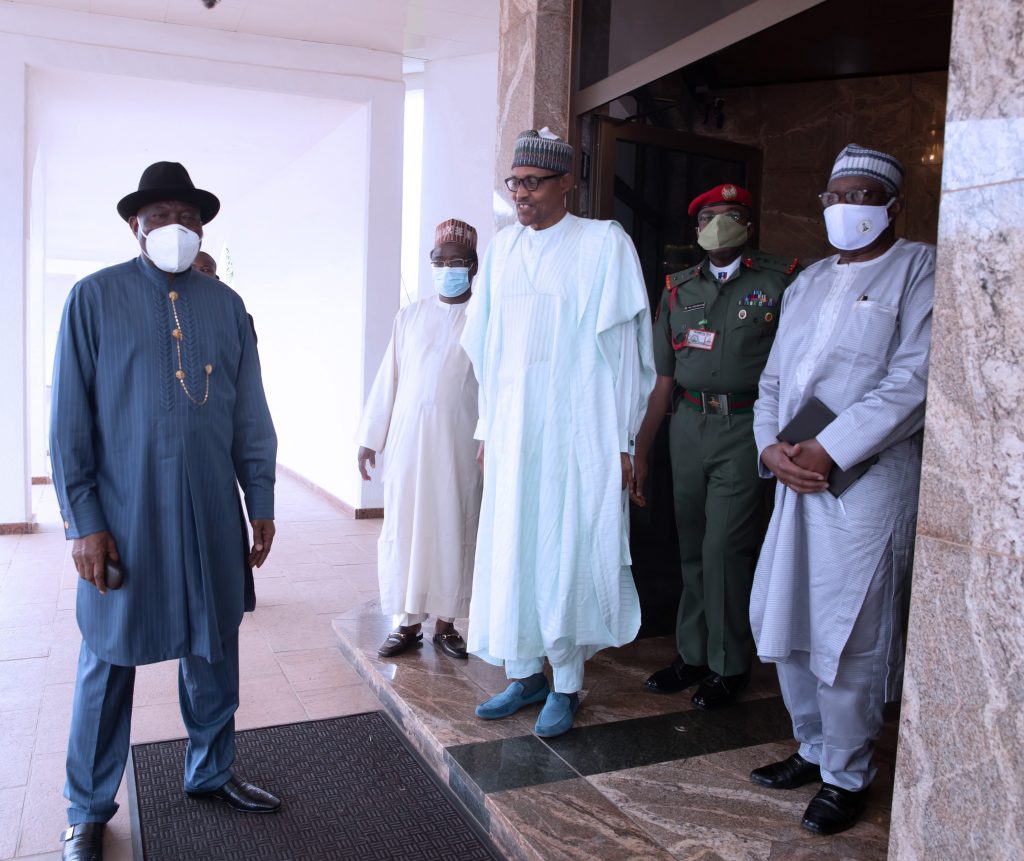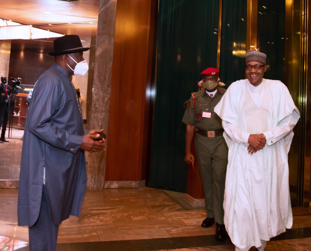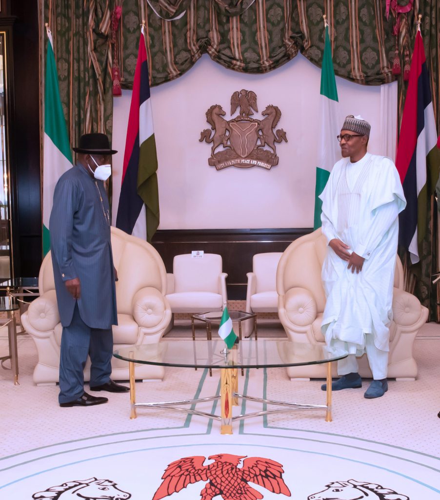 President Muhammadu Buhari Tuesday received his immediate predecessor in office, Dr Goodluck Jonathan, at State House, Abuja.