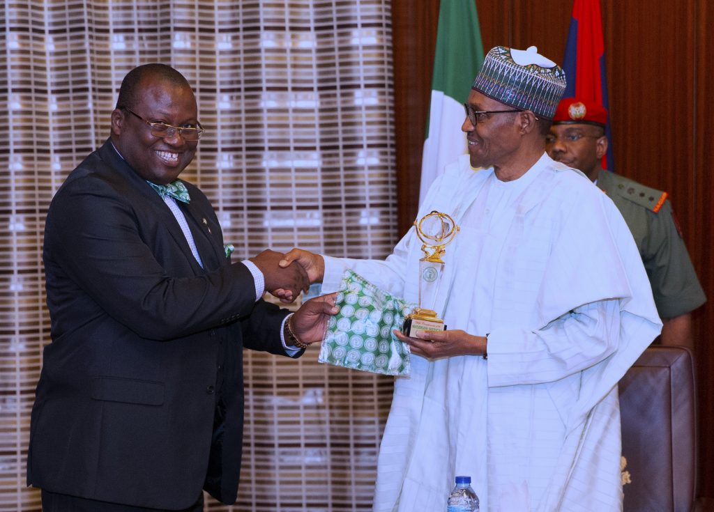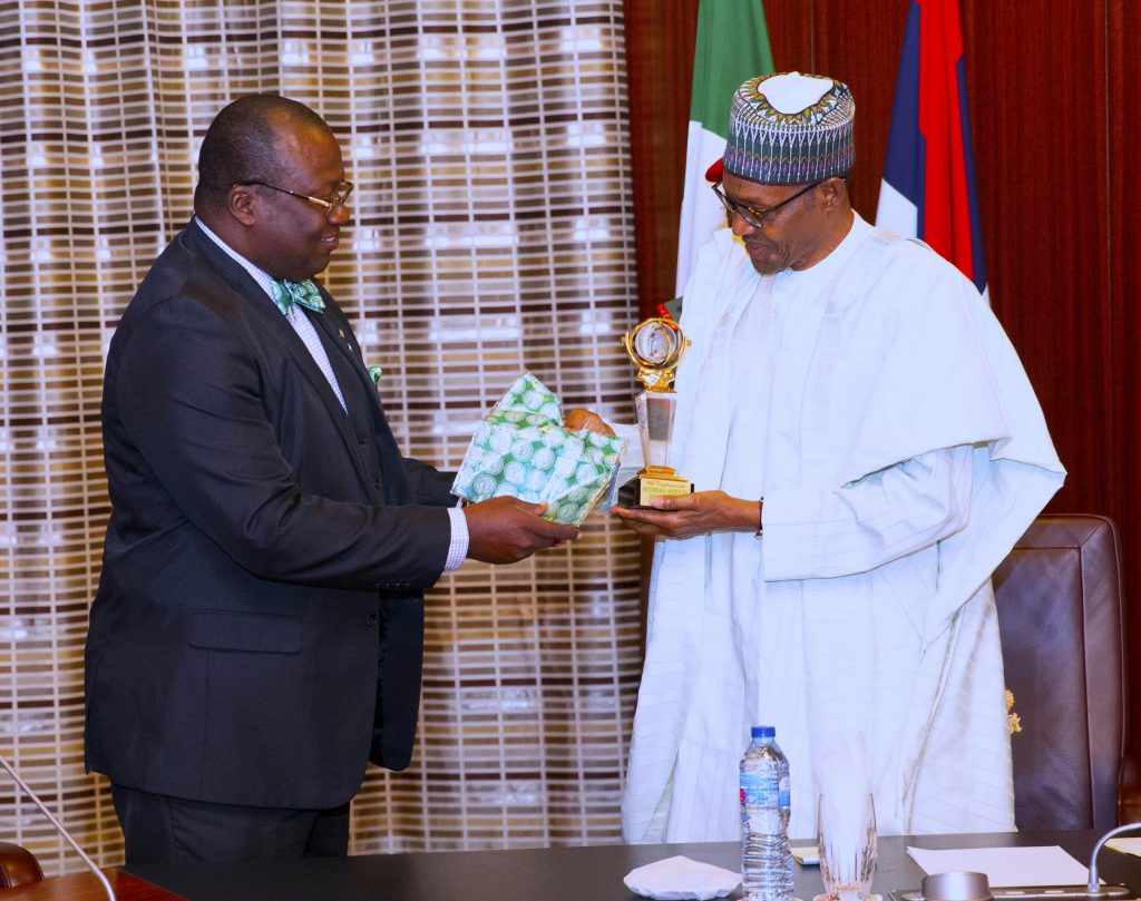 President Muhammadu Buhari receives a gift from the new President of the Nigerian Medical Association and Leader of the delegation, Dr Francis Adedayo Faduyile