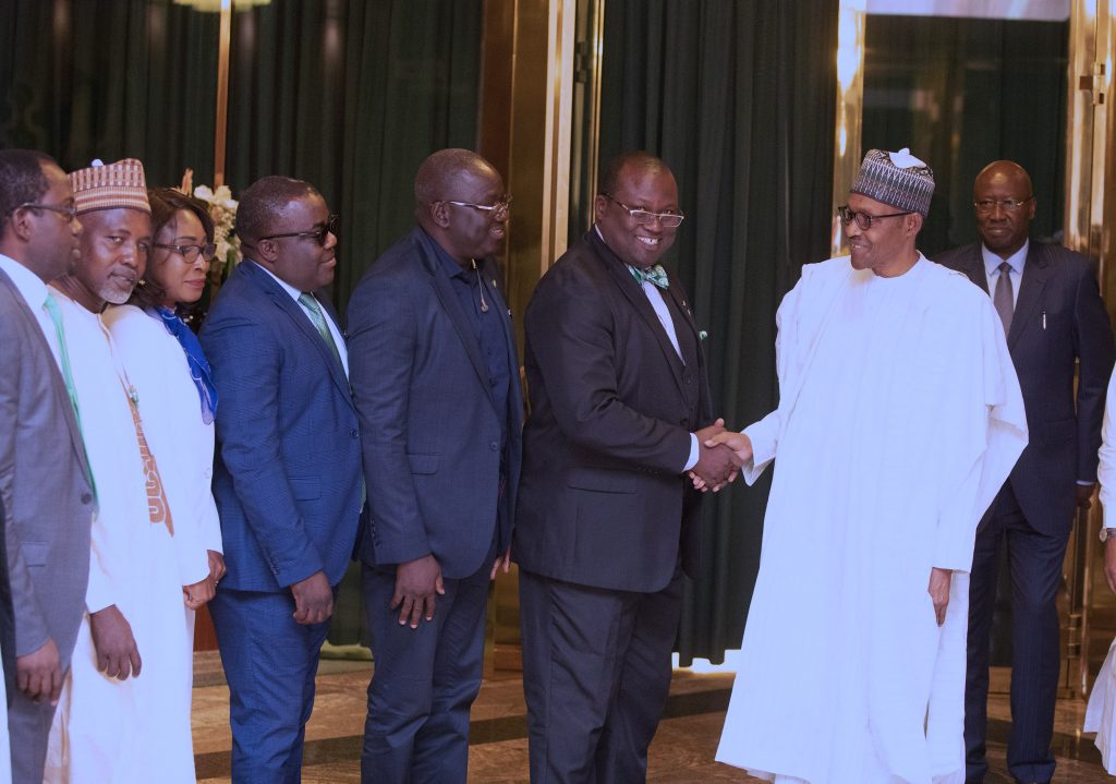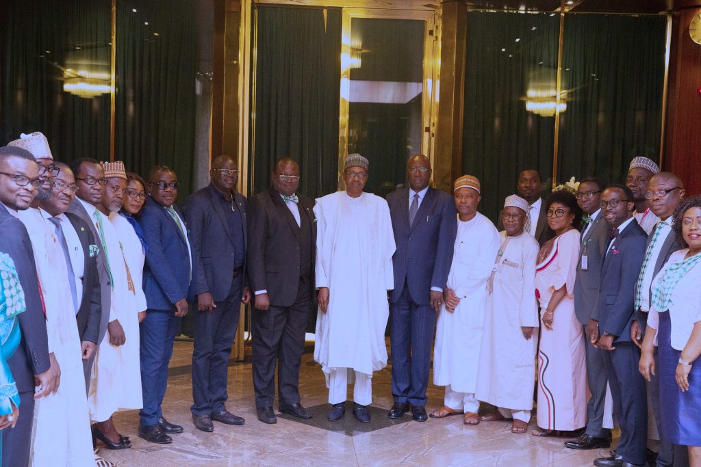President Muhammadu Buhari, The new President of the Nigerian Medical Association and Leader of the delegation, Dr Francis Adedayo Faduyile. Dr. Kenneth Tijo, Dr. Ofemm Enang, Dr. Olumuyiwa Odusote, Dr Benjamin Umezuruike, Dr Nayagawa Ayuwaja, Dr Abdulgafar Jimoh and others