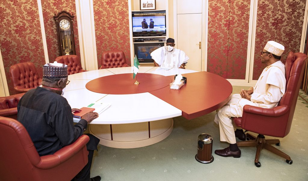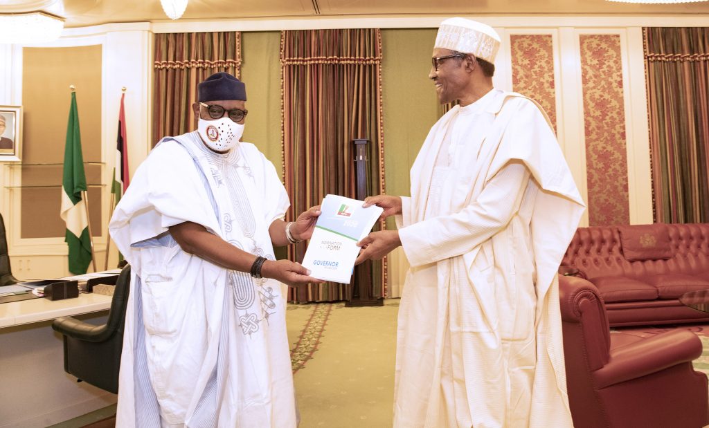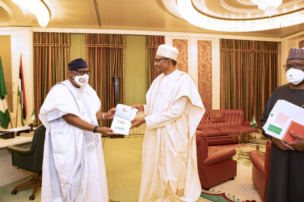 PRESIDENT BUHARI RECEIVES ONDO GOV AKEREDOLU 3. President Muhammadu Buhari (M) The Ondo State Governor, H.E Rotimi Akeredolu and Chief of Staff Prof Ibrahim Gambari as he presents his expression of interest form for a 2nd term of office as Governor held at the State House Abuja. PHOTO; SUNDAY AGHAEZE. JUNE 16 2020