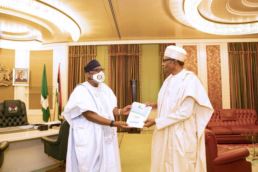 PRESIDENT BUHARI RECEIVES ONDO GOV AKEREDOLU 1A. President Muhammadu Buhari (M) The Ondo State Governor, H.E Rotimi Akeredolu as he presents his expression of interest form for a 2nd term of office as Governor held at the State House Abuja. PHOTO; SUNDAY AGHAEZE. JUNE 16 2020