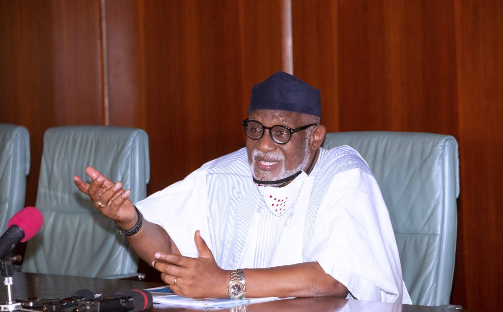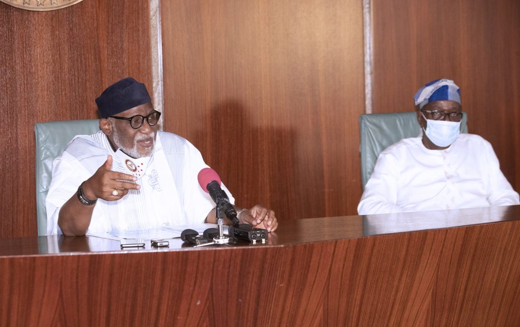 PRESIDENT BUHARI RECEIVES ONDO GOV AKEREDOLU 5A&B. The Ondo State Governor, H.E Rotimi Akeredolu briefing the State Press corps after presenting his expression of interest for a 2nd term of office as Governor held at the State House Abuja. PHOTO; SUNDAY AGHAEZE. JUNE 16 2020
