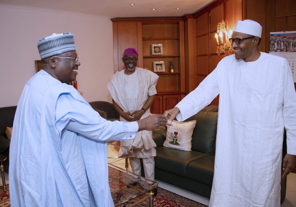 President Muhammadu Buhari (M) receives President of the Senate, Distinguish Senator Ahmed Lawan, Speaker Rt Hon Femi Gbajabiamila