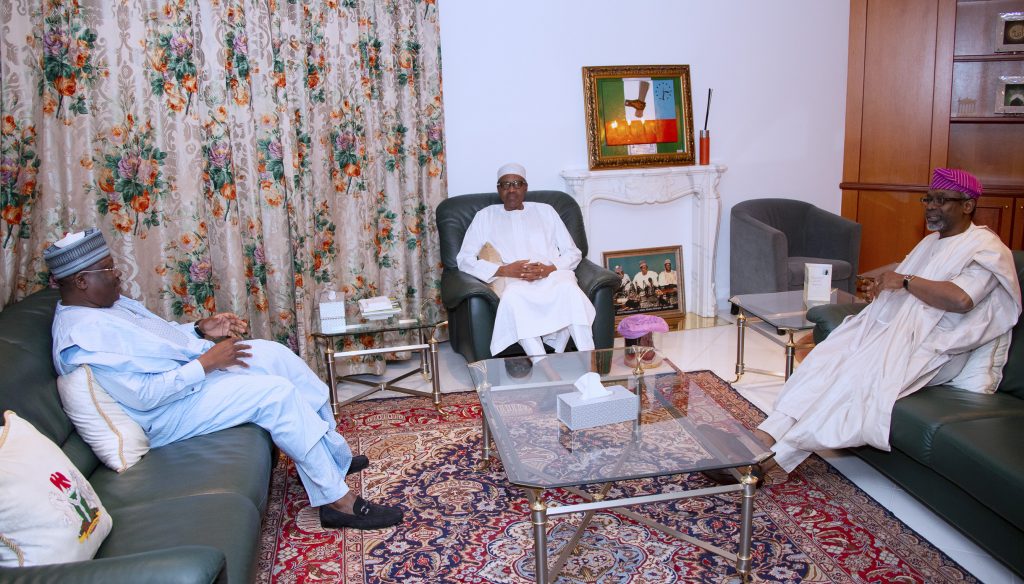 President Muhammadu Buhari receives the President of the Senate, distinguish Senator Ahmed Lawan and Speaker, Rt. Hon. Femi Gbajabiamila at the residence Presidential Villa on Sunday night (October 16, 2019) in Abuja.