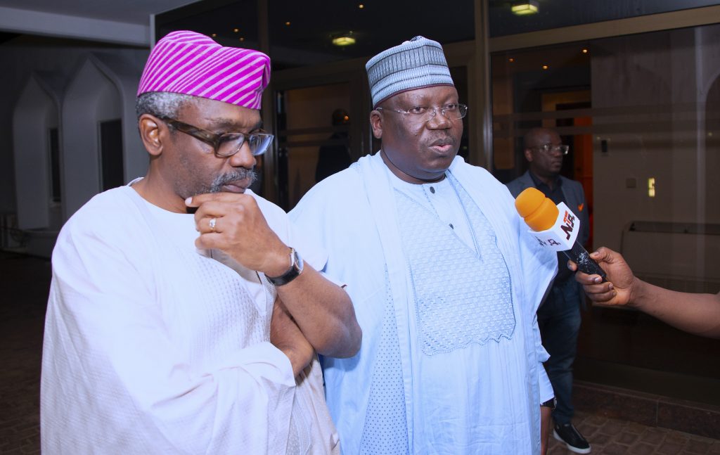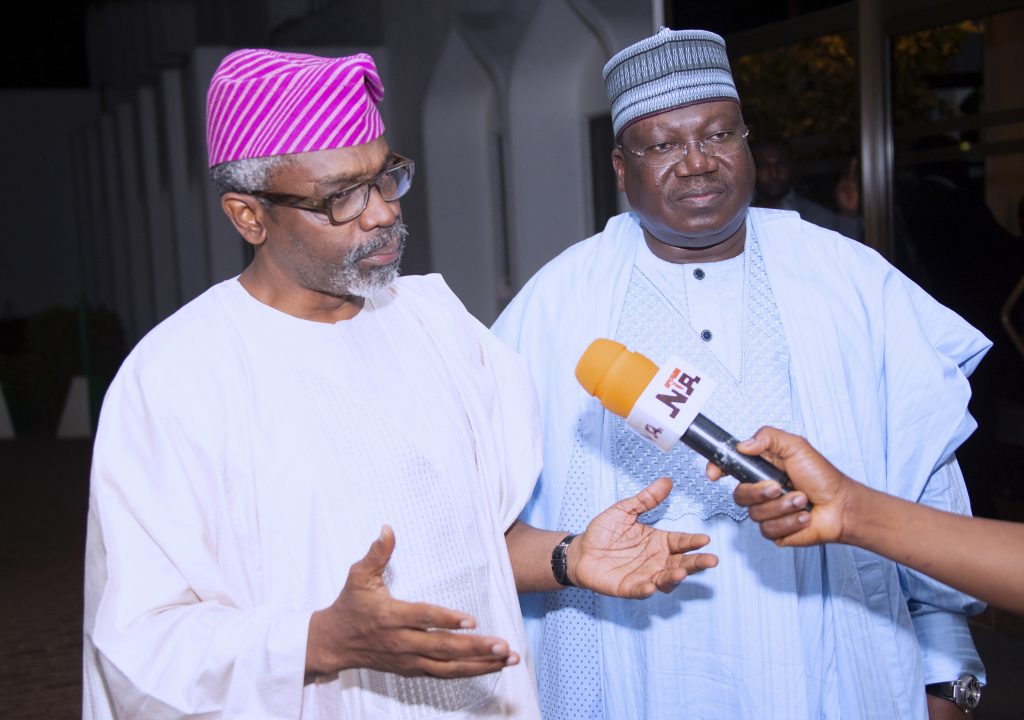 Speaker Rt Hon Femi Gbajabiamila with President of the SENATE, Distinguish Senator Ahmed Lawan brief the press after the meeting with President Buhari