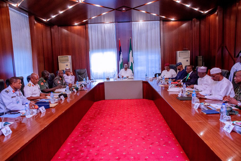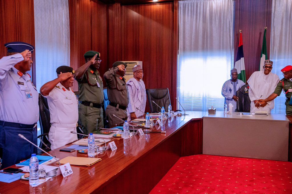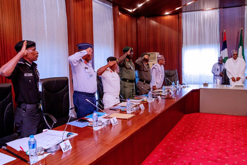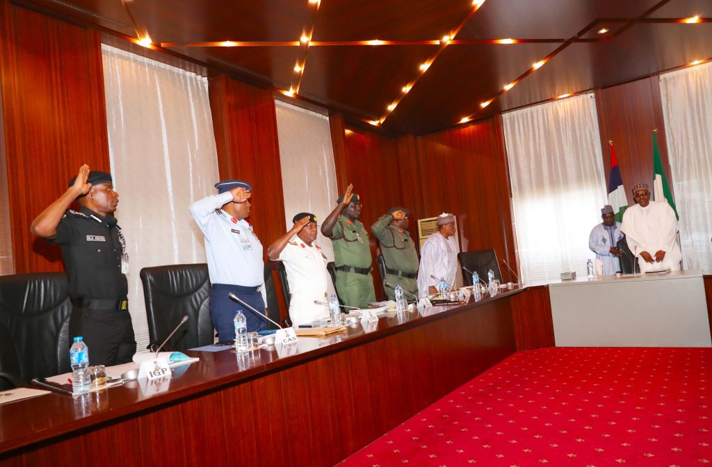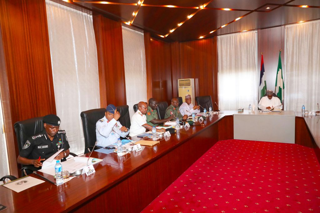 R-L; President Muhammadu Buhari receives a Security briefing from the Minister of Defence, Brig-General Mansur Dan Ali, Chief of Defence Staff, General Abayomi Olonisakin, Chief of Army Staff, Lt-Gen T.Y Buratai, Chief of Naval Staff, Ibok Ekwe Ibas, Chief of Air Staff, Air Marshal Sadique Abubakar, Inspector General of Police, Mr. Mohammed Adamu