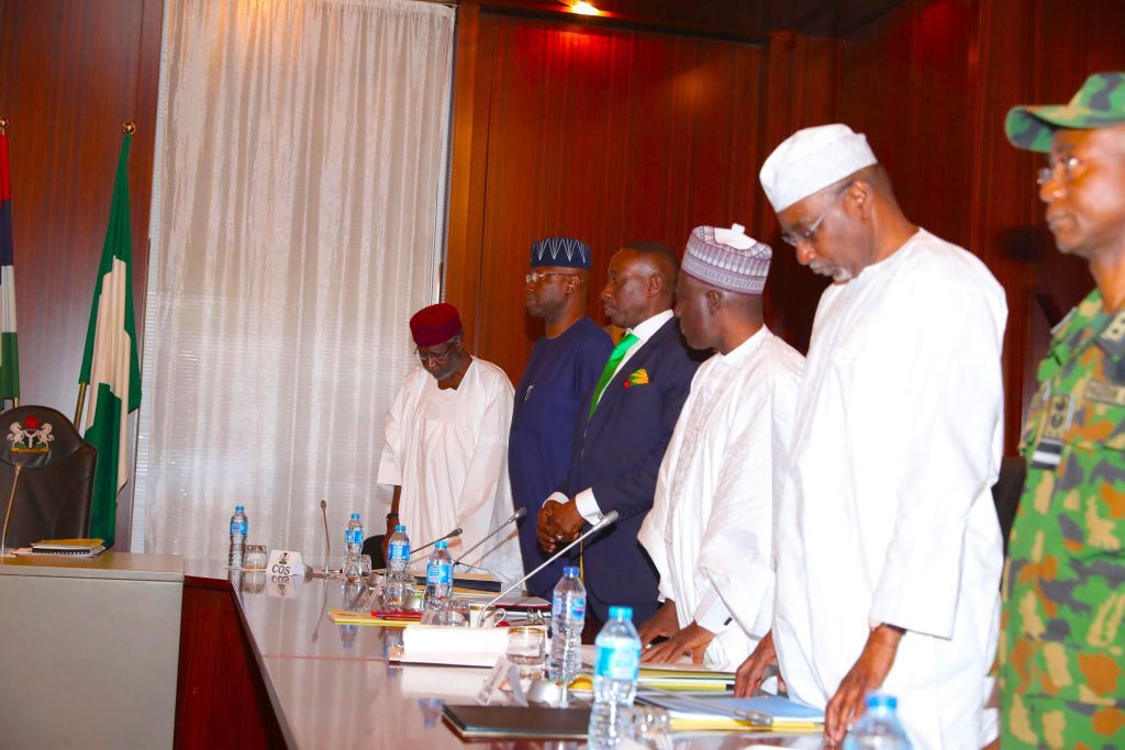 L-R; Chief of Staff, Mallam Abba Kyari, SGF, Mr. Boss Mustapha, NSA MAJ Gen Babagana Monguno,Director General DSS, Mr. Yusuf Magaji Bichi, Director General, (NIA), Mr. Ahmed Rufai Abubakar and Chief of Defence Intelligence, Air Vice Marshal Mohammed Saliu Usman and other support staff