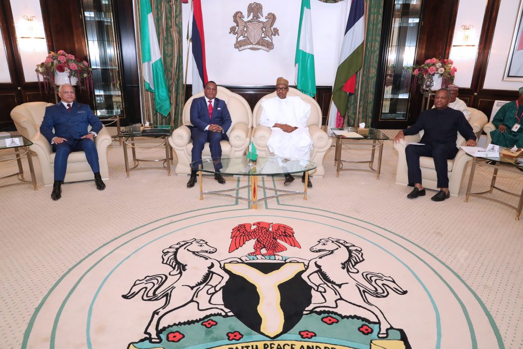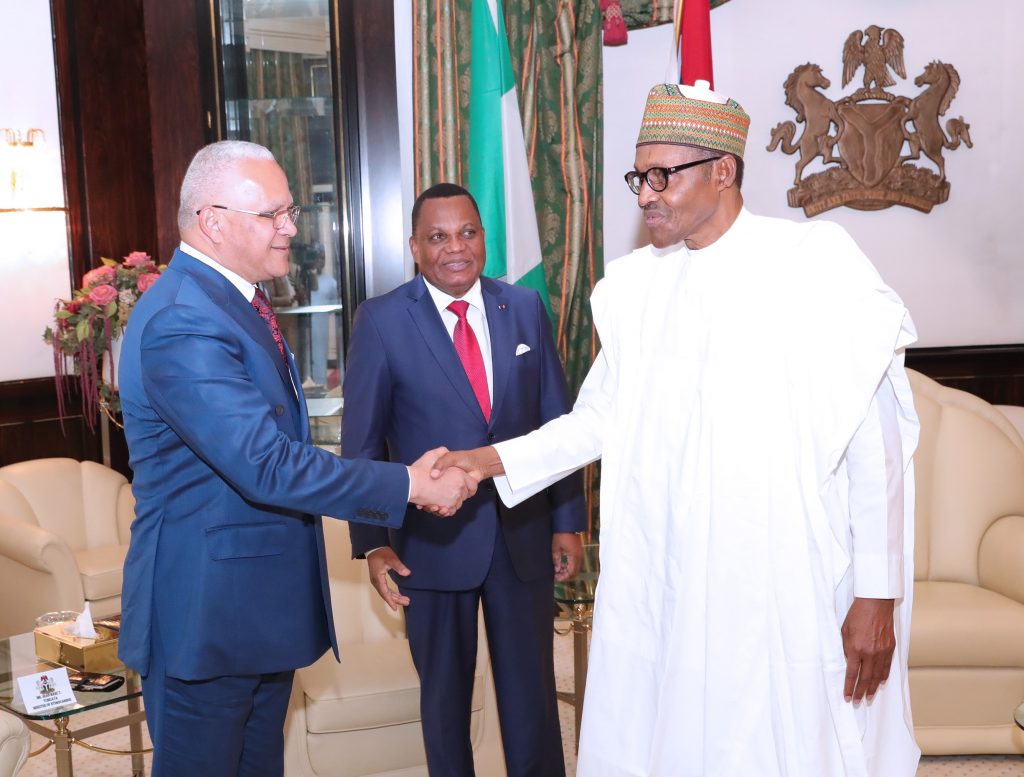 President Muhammad Buhari in a handshake with the Minister of Hydrocarbon, Congo, Mr. Jean-Marc Tchicaya. With them The Special Envoy and Minister of Foreign Affairs Republic of Congo, H.E Jean C. Gakosso (M) during an audience at the State House, Abuja on Thursday, March 28, 2019.
