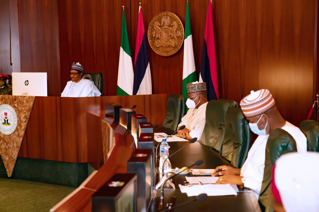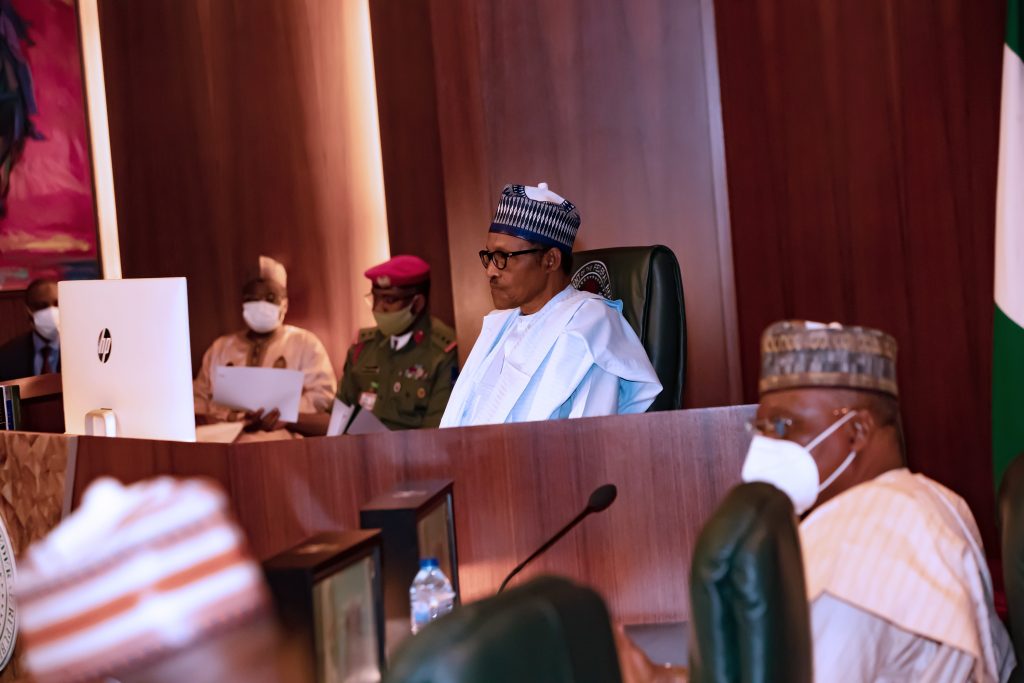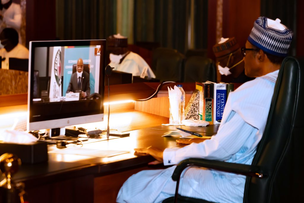 President Muhammadu Buhari receives virtual briefing from the ECOWAS President Kassi-Brou on Covid-19 held at the Council Chambers State House, Abuja on Thursday, June 11, 2020.