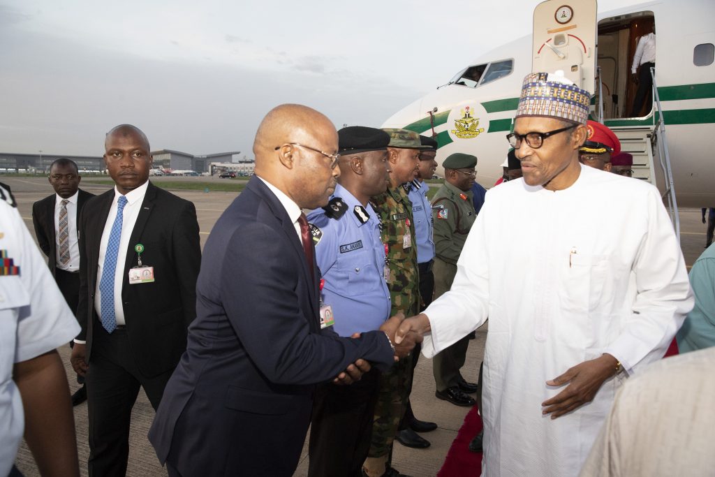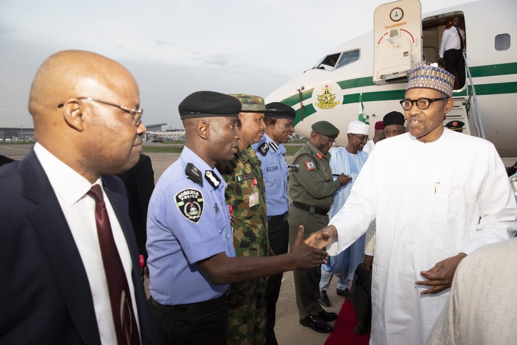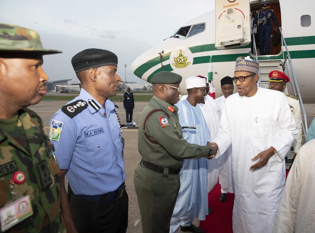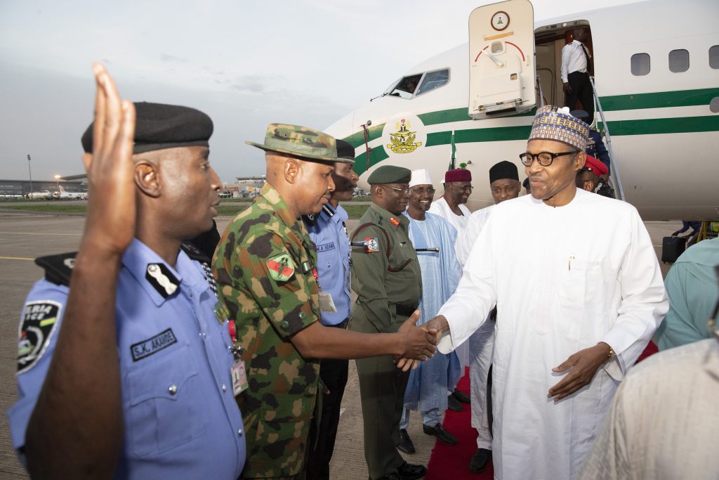 President Muhammadu Buhari in a handshake with Commander Bridge of Guards, Brigadier General Umar Thomas Musa and Presidential Police Airfleet, Asst Commissioner of Police, Mr. S.k Akande during the arrival of President from Mecca on Tuesday, May 21, 2019.